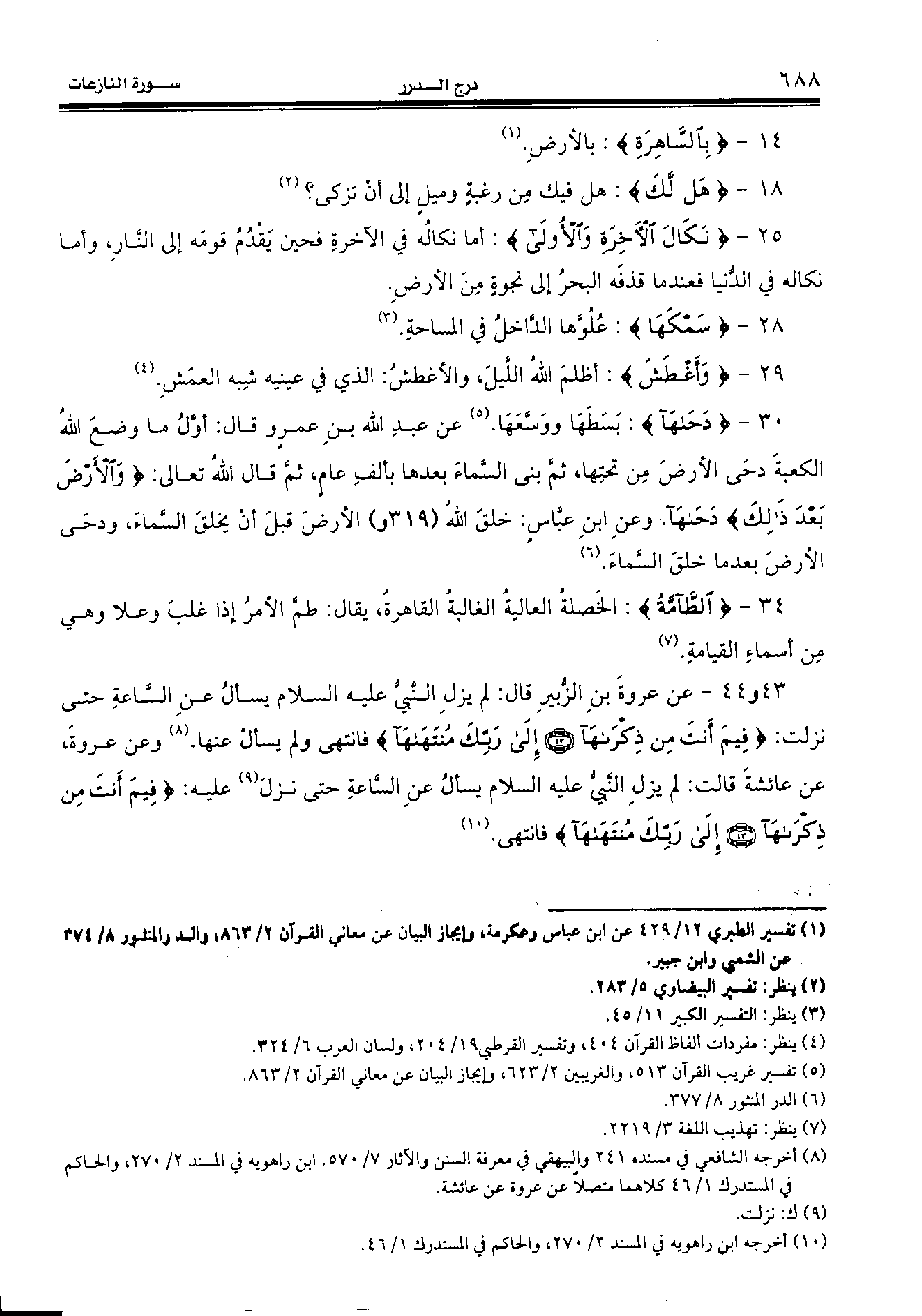 43 و 44 - عن عروة بن الزّبير قال: لم يزل النّبيّ عليه السّلام يسأل عن السّاعة حتى نزلت: {فِيمَ أَنْتَ مِنْ ذِكْراها (43) إِلى رَبِّكَ مُنْتَهاها} فانتهى ولم يسأل عنها. (¬8) وعن عروة، عن عائشة قالت: لم يزل النّبيّ عليه السّلام يسأل عن السّاعة حتى نزل (¬9) عليه: {فِيمَ أَنْتَ مِنْ ذِكْراها (43) إِلى رَبِّكَ مُنْتَهاها} فانتهى. (¬10)