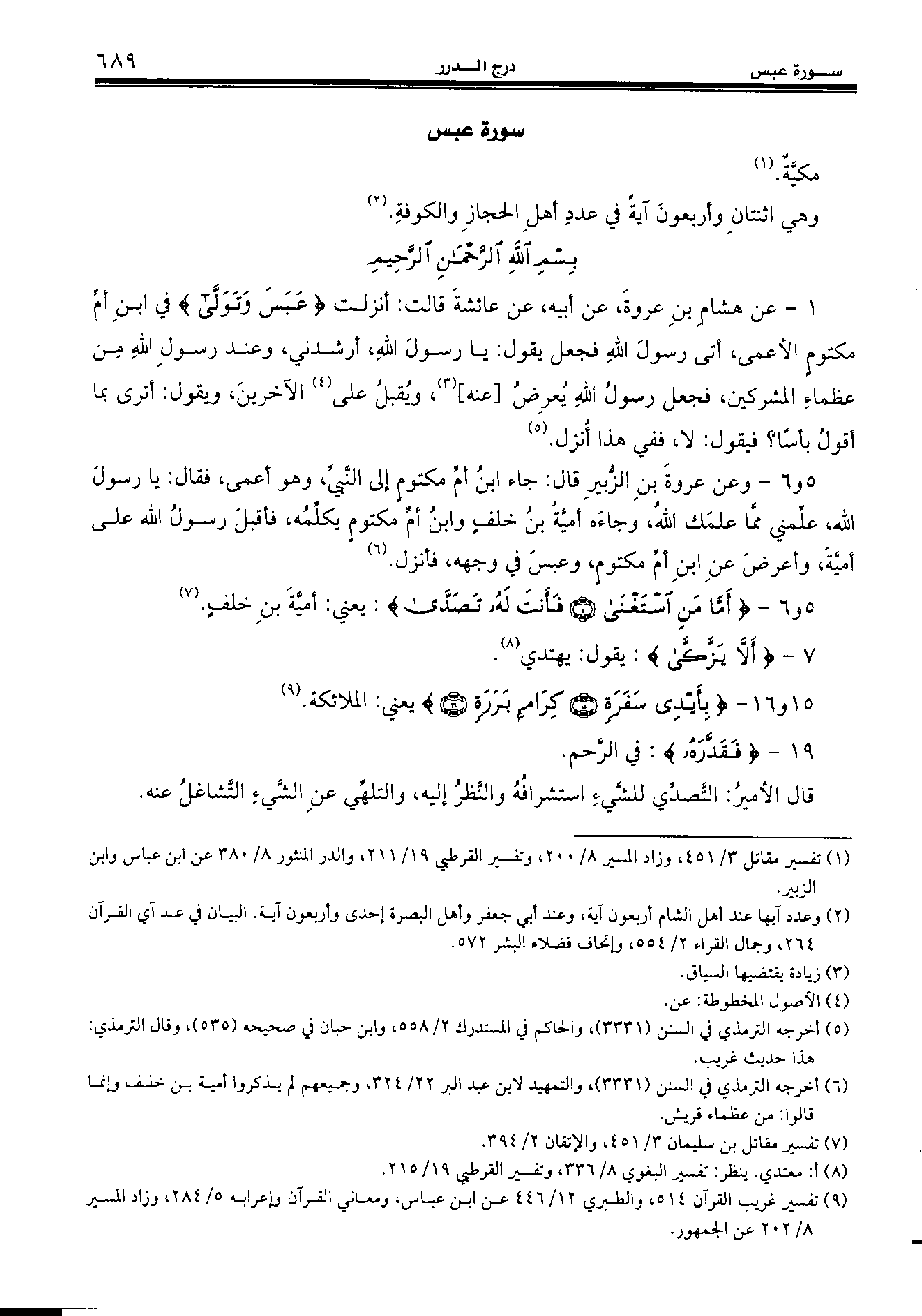 5 و 6 - وعن عروة بن الزّبير قال: جاء ابن أمّ مكتوم إلى النّبيّ، وهو أعمى، فقال: يا رسول الله، علّمني ممّا علمك الله، وجاءه أميّة بن خلف وابن أمّ مكتوم يكلّمه، فأقبل رسول الله على أميّة، وأعرض عن ابن أمّ مكتوم، وعبس في وجهه، فأنزل. (¬6)