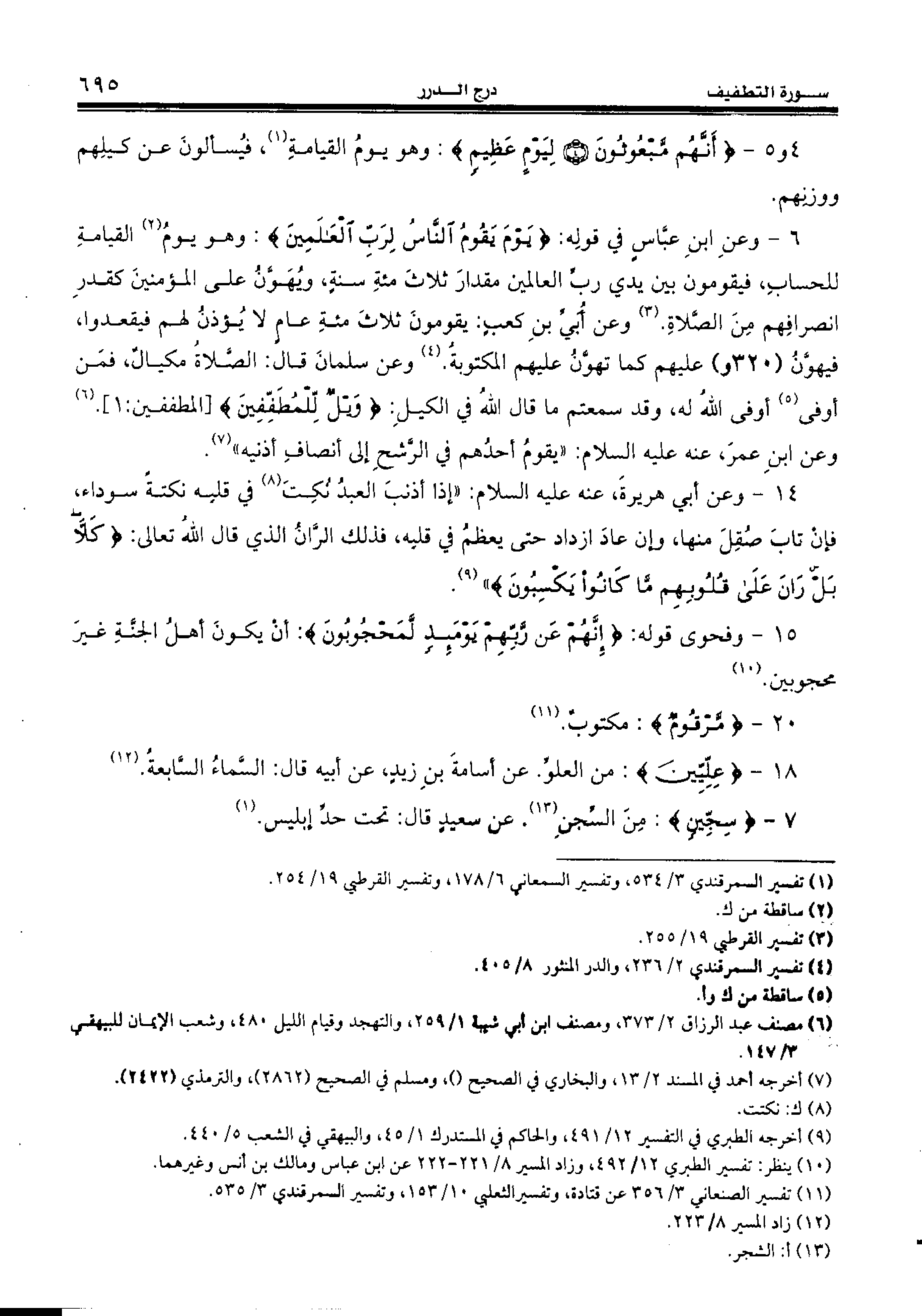 6 - وعن ابن عبّاس في قوله: {يَوْمَ يَقُومُ النّاسُ لِرَبِّ الْعالَمِينَ:} وهو يوم (¬2) القيامة للحساب، فيقومون بين يدي ربّ العالمين مقدار ثلاث مئة سنة، ويهوّن على المؤمنين كقدر انصرافهم من الصّلاة. (¬3) وعن أبيّ بن كعب: يقومون ثلاث مئة عام لا يؤذن لهم فيقعدوا، فيهوّن (320 و) عليهم كما تهوّن عليهم المكتوبة. (¬4) وعن سلمان قال: الصّلاة مكيال، فمن أوفى (¬5) أوفى الله له، وقد سمعتم ما قال الله في الكيل: {وَيْلٌ لِلْمُطَفِّفِينَ} [المطففين:1]. (¬6)