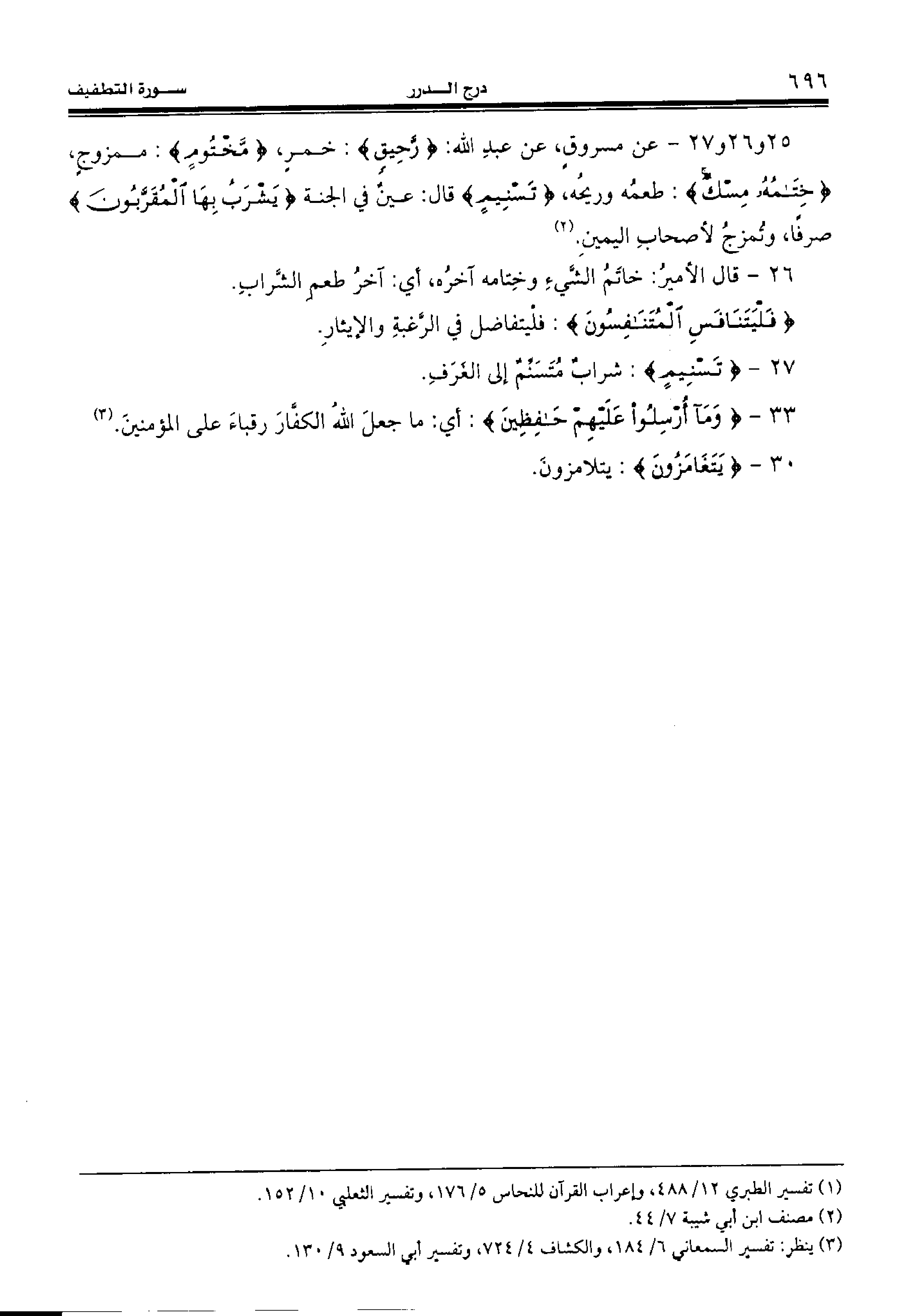 25 و 26 و 27 - عن مسروق، عن عبد الله: {رَحِيقٍ:} خمر، {مَخْتُومٍ:} ممزوج، {خِتامُهُ مِسْكٌ:} طعمه وريحه، {تَسْنِيمٍ} قال: عين في الجنة {يَشْرَبُ بِهَا الْمُقَرَّبُونَ} صرفا، وتمزج لأصحاب اليمين. (¬2)
