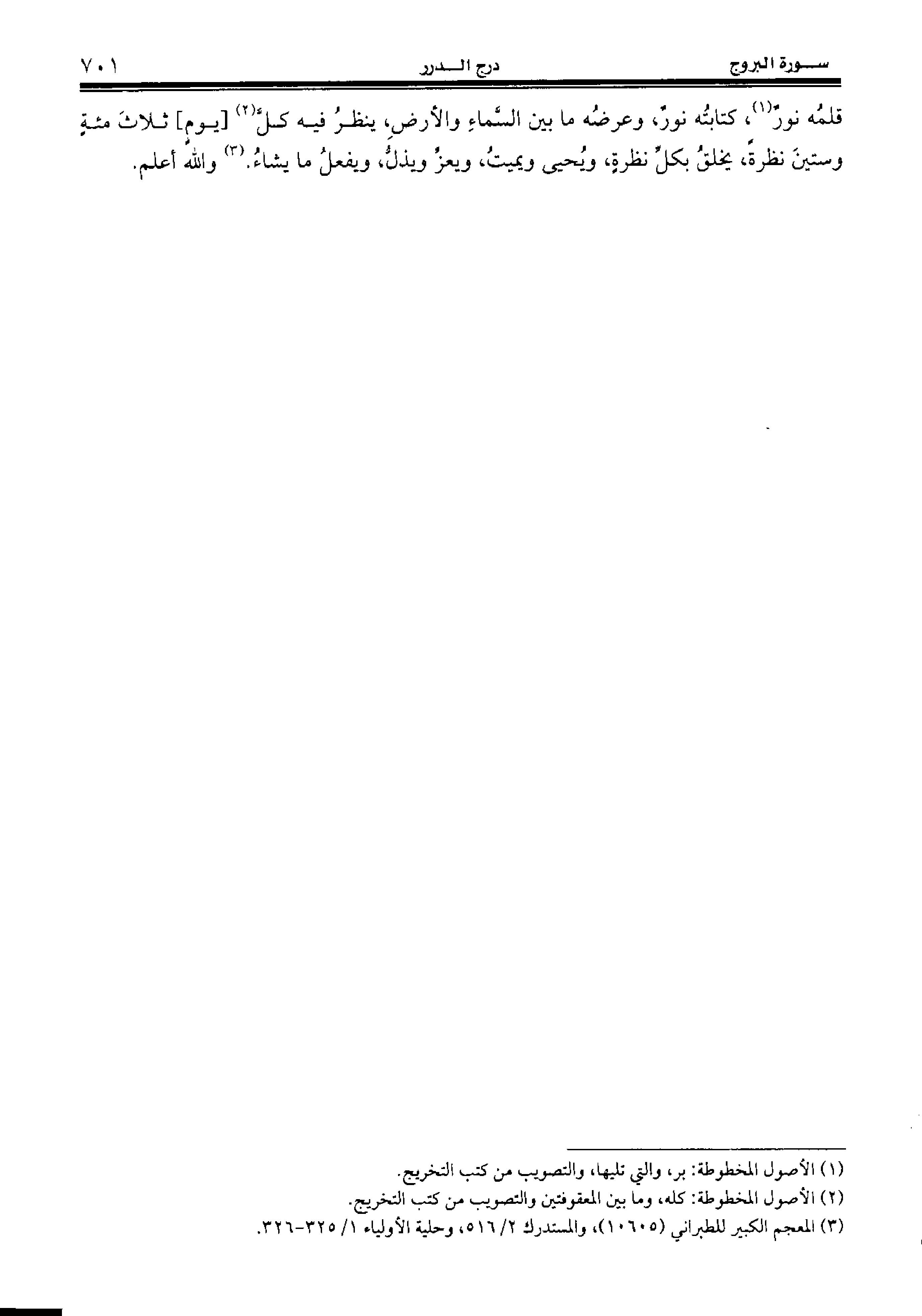 قلمه نور (¬1)، كتابته نور، وعرضه ما بين السّماء والأرض، ينظر فيه كلّ (¬2) [يوم] ثلاث مئة وستين نظرة، يخلق بكلّ نظرة، ويحيى ويميت، ويعزّ ويذلّ، ويفعل ما يشاء. (¬3) والله أعلم.