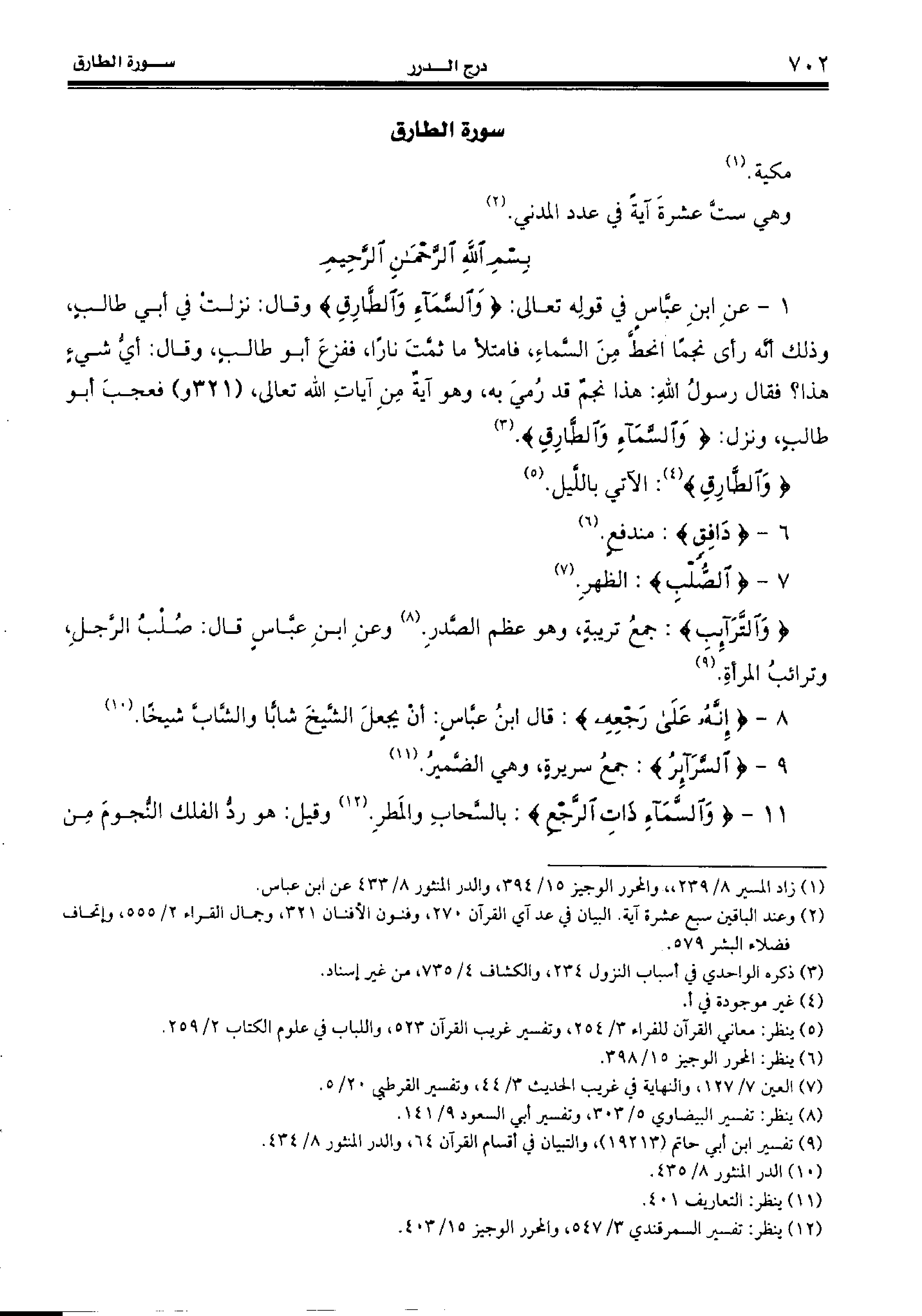 1 - عن ابن عبّاس في قوله تعالى: {وَالسَّماءِ وَالطّارِقِ} وقال: نزلت في أبي طالب، وذلك أنّه رأى نجما انحطّ من السّماء، فامتلأ ما ثمّت نارا، ففزع أبو طالب، وقال: أيّ شيء هذا؟ فقال رسول الله: هذا نجم قد رمي به، وهو آية من آيات الله تعالى، (321 و) فعجب أبو طالب، ونزل: {وَالسَّماءِ وَالطّارِقِ.} (¬3)