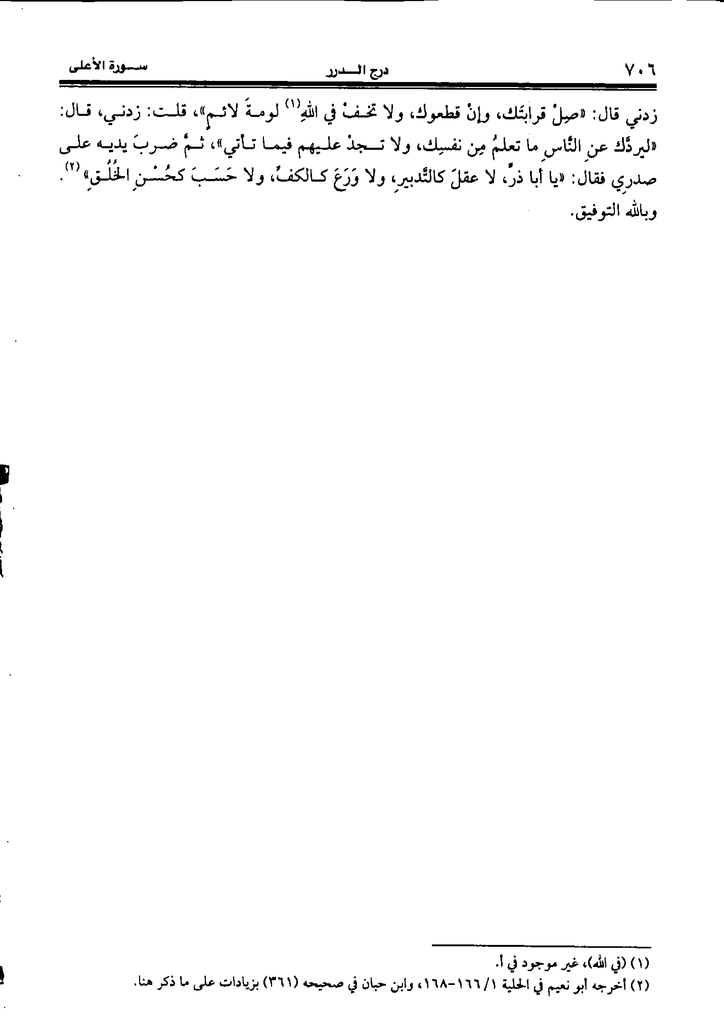 زدني قال: «صل قرابتك، وإن قطعوك، ولا تخف في الله (¬1) لومة لائم»، قلت: زدني، قال: