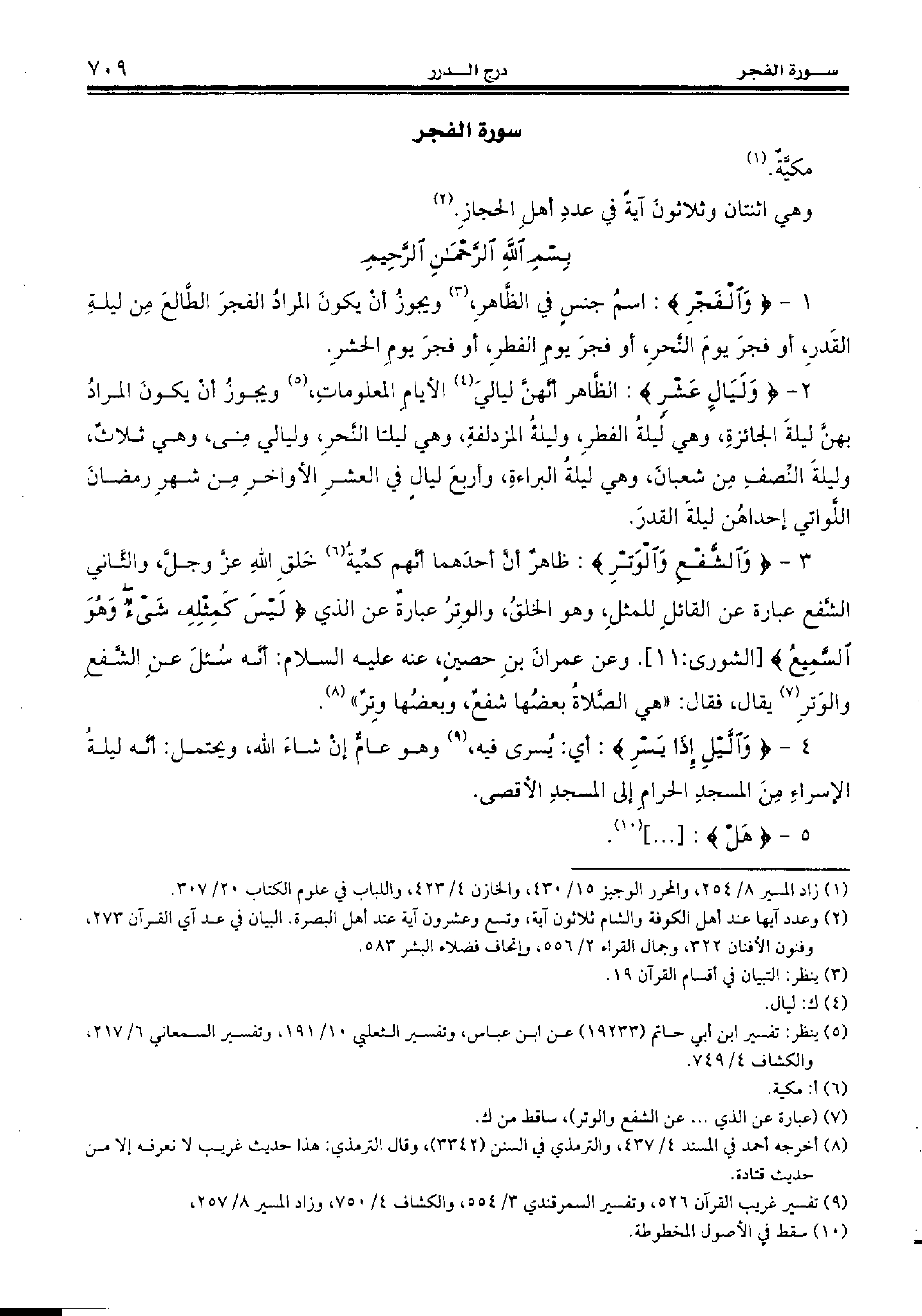 1 - {وَالْفَجْرِ:} اسم جنس في الظّاهر، (¬3) ويجوز أن يكون المراد الفجر الطّالع من ليلة القدر، أو فجر يوم النّحر، أو فجر يوم الفطر، أو فجر يوم الحشر.