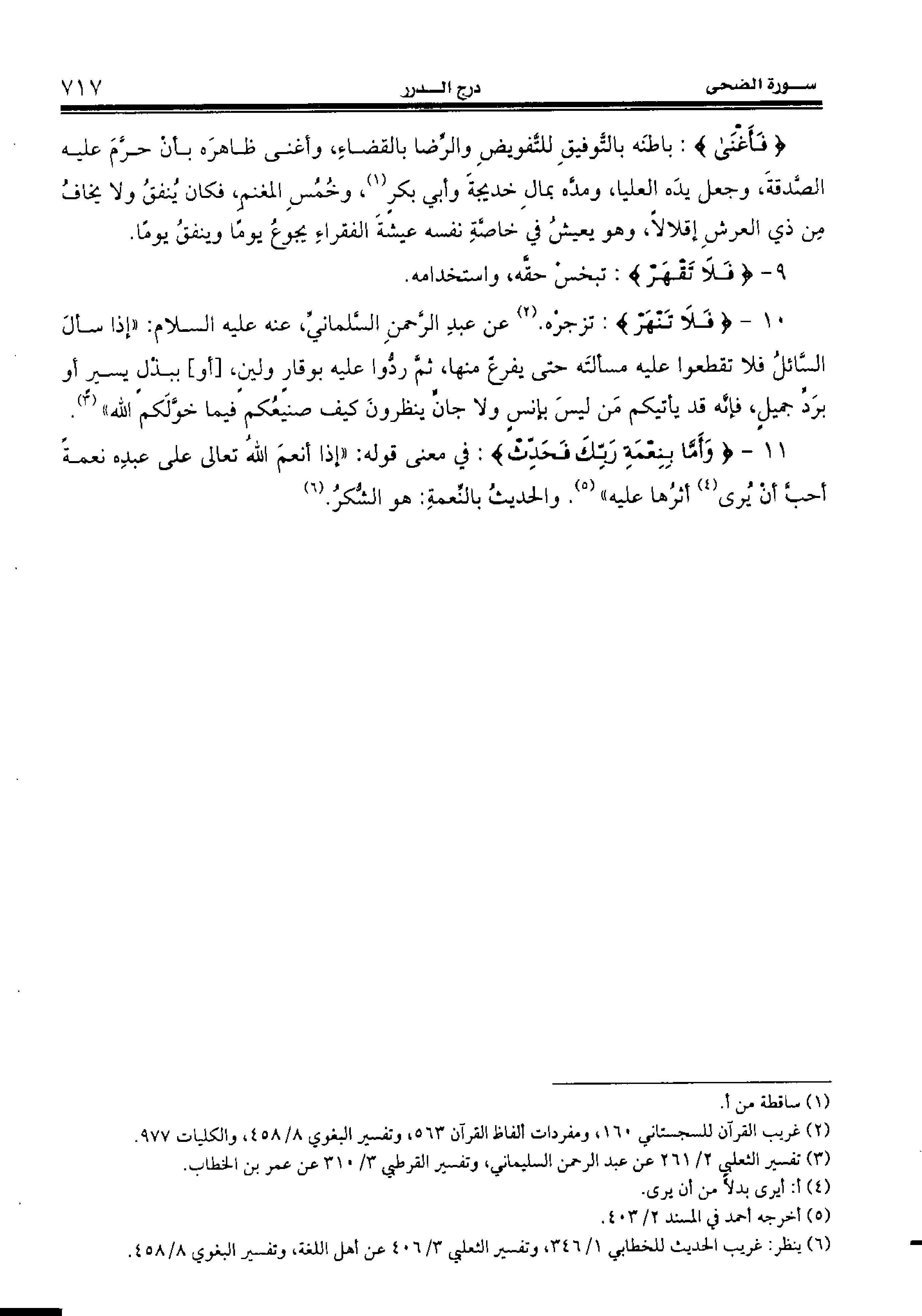11 - {وَأَمّا بِنِعْمَةِ رَبِّكَ فَحَدِّثْ:} في معنى قوله: «إذا أنعم الله تعالى على عبده نعمة أحبّ أن يرى (¬4) أثرها عليه» (¬5). والحديث بالنّعمة: هو الشّكر. (¬6)