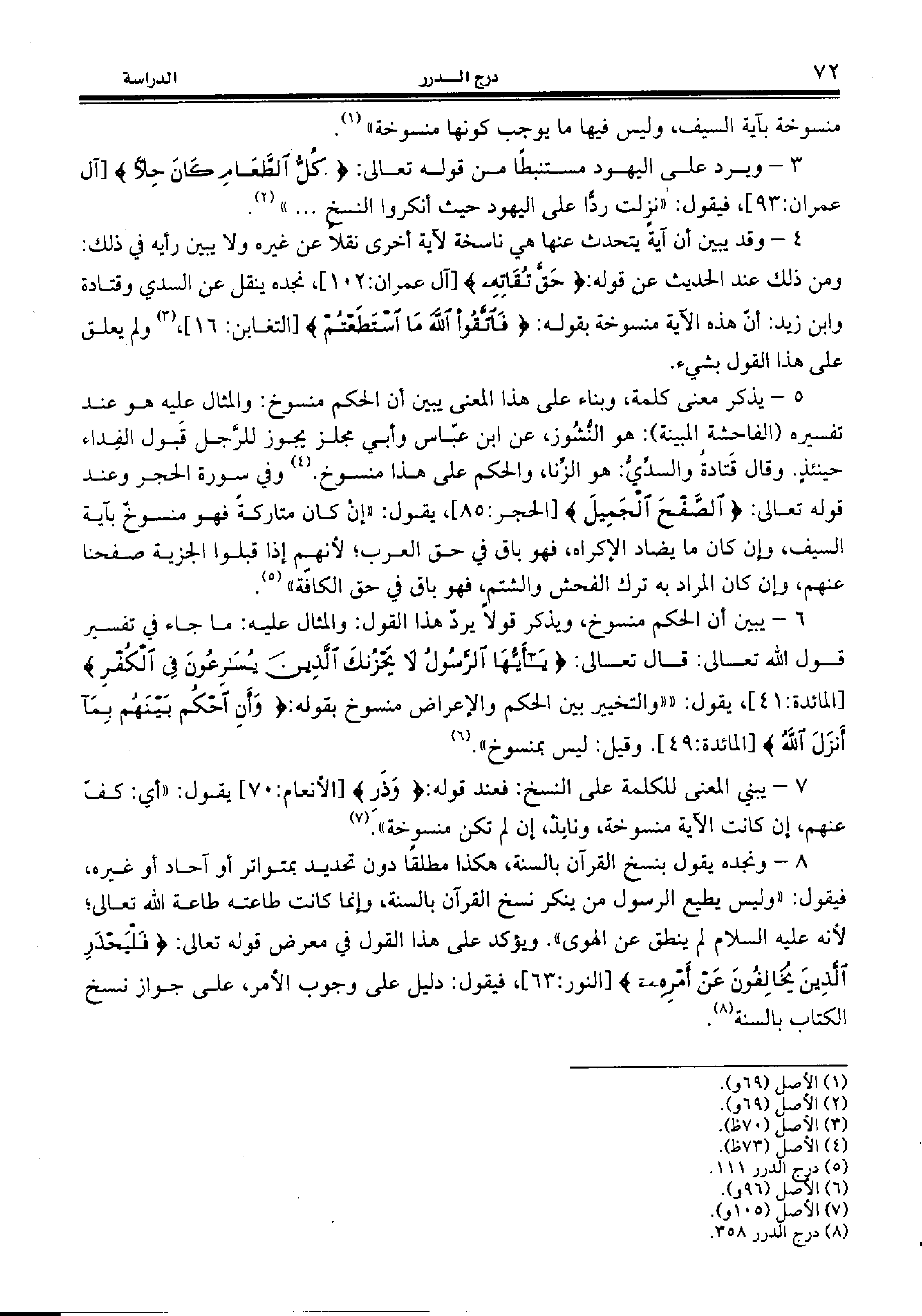6 - يبين أن الحكم منسوخ، ويذكر قولا يردّ هذا القول: والمثال عليه: ما جاء في تفسير قول الله تعالى: قال تعالى: {يا أَيُّهَا الرَّسُولُ لا يَحْزُنْكَ الَّذِينَ يُسارِعُونَ فِي الْكُفْرِ} [المائدة:41]، يقول: ««والتخيير بين الحكم والإعراض منسوخ بقوله: {وَأَنِ اُحْكُمْ بَيْنَهُمْ بِما أَنْزَلَ اللهُ} [المائدة:49]. وقيل: ليس بمنسوخ». (¬6)