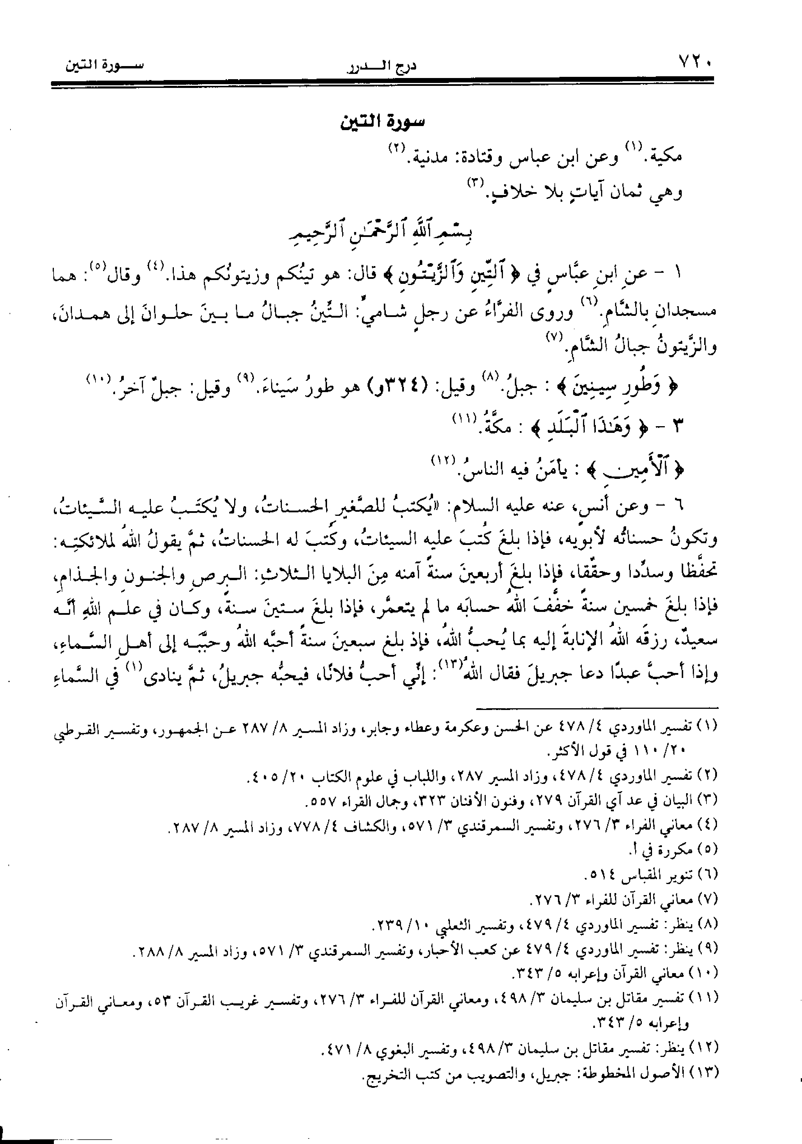 1 - عن ابن عبّاس في {التِّينِ وَالزَّيْتُونِ} قال: هو تينكم وزيتونكم هذا. (¬4) وقال (¬5): هما مسجدان بالشّام. (¬6) وروى الفرّاء عن رجل شاميّ: التّين جبال ما بين حلوان إلى همدان، والزّيتون جبال الشّام. (¬7)