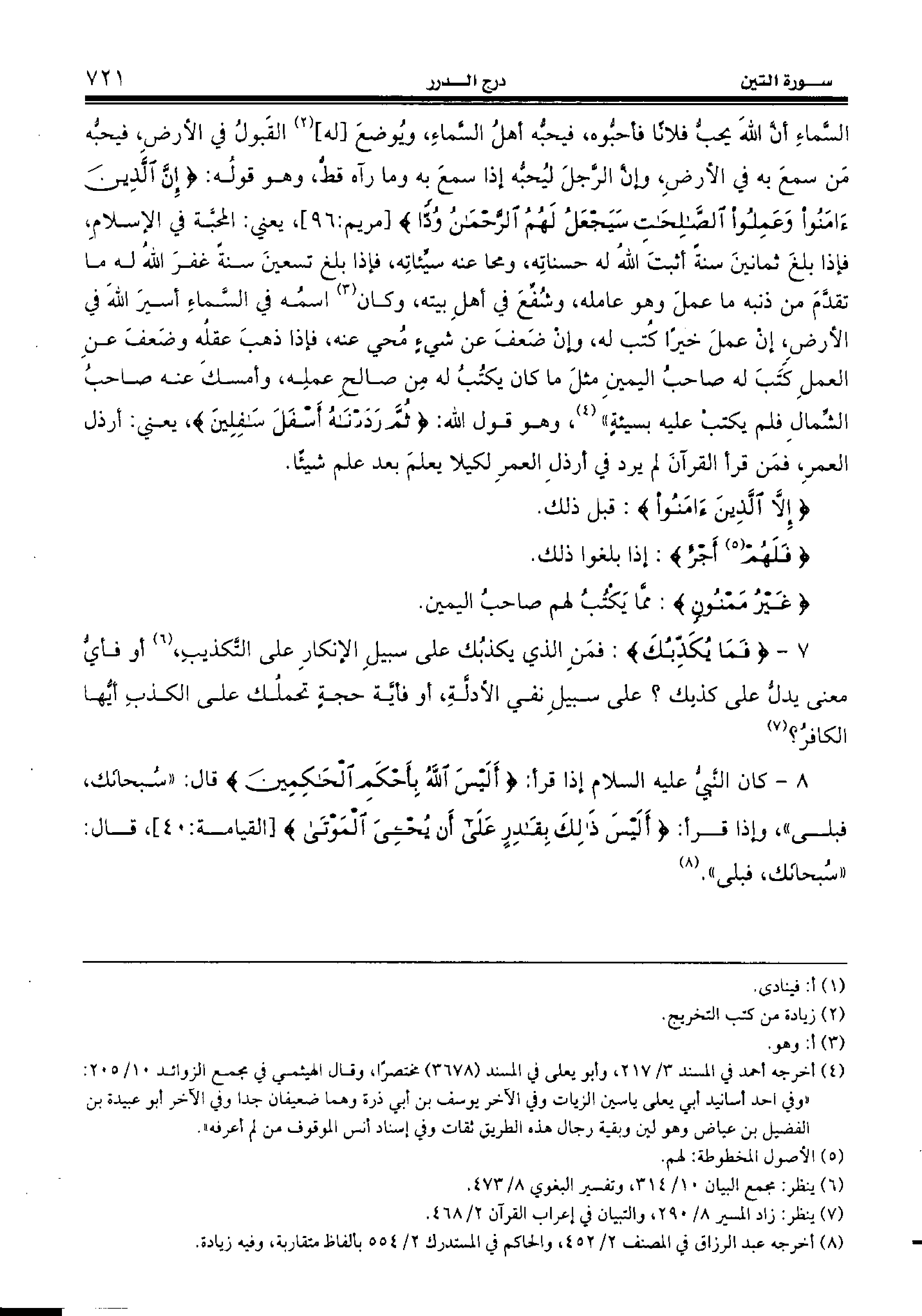 8 - كان النّبيّ عليه السّلام إذا قرأ: {أَلَيْسَ اللهُ بِأَحْكَمِ الْحاكِمِينَ} قال: «سبحانك، فبلى»، وإذا قرأ: {أَلَيْسَ ذلِكَ بِقادِرٍ عَلى أَنْ يُحْيِيَ الْمَوْتى} [القيامة:40]، قال: