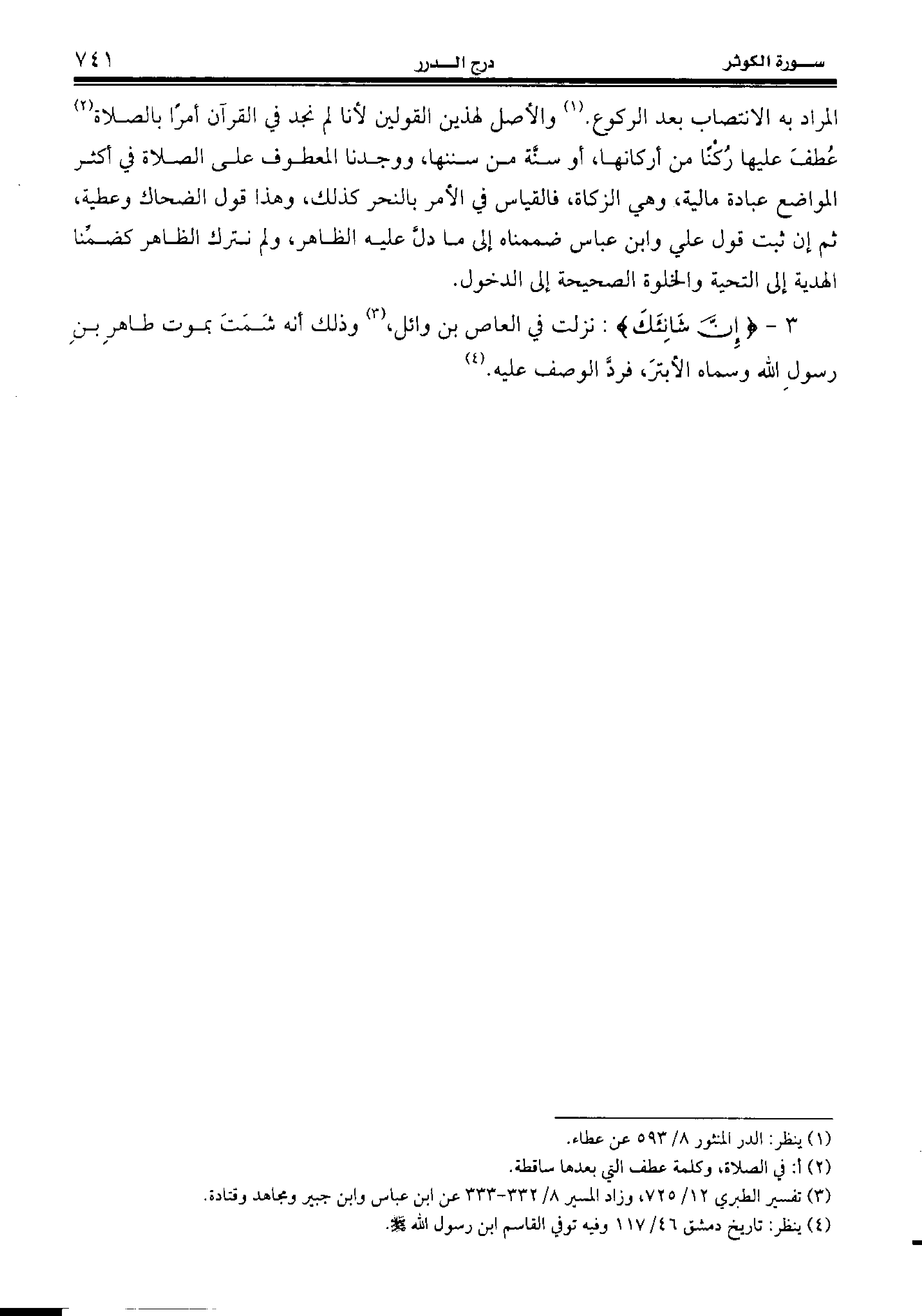3 - {إِنَّ شانِئَكَ:} نزلت في العاص بن وائل، (¬3) وذلك أنه شمت بموت طاهر بن رسول الله وسماه الأبتر، فردّ الوصف عليه. (¬4)