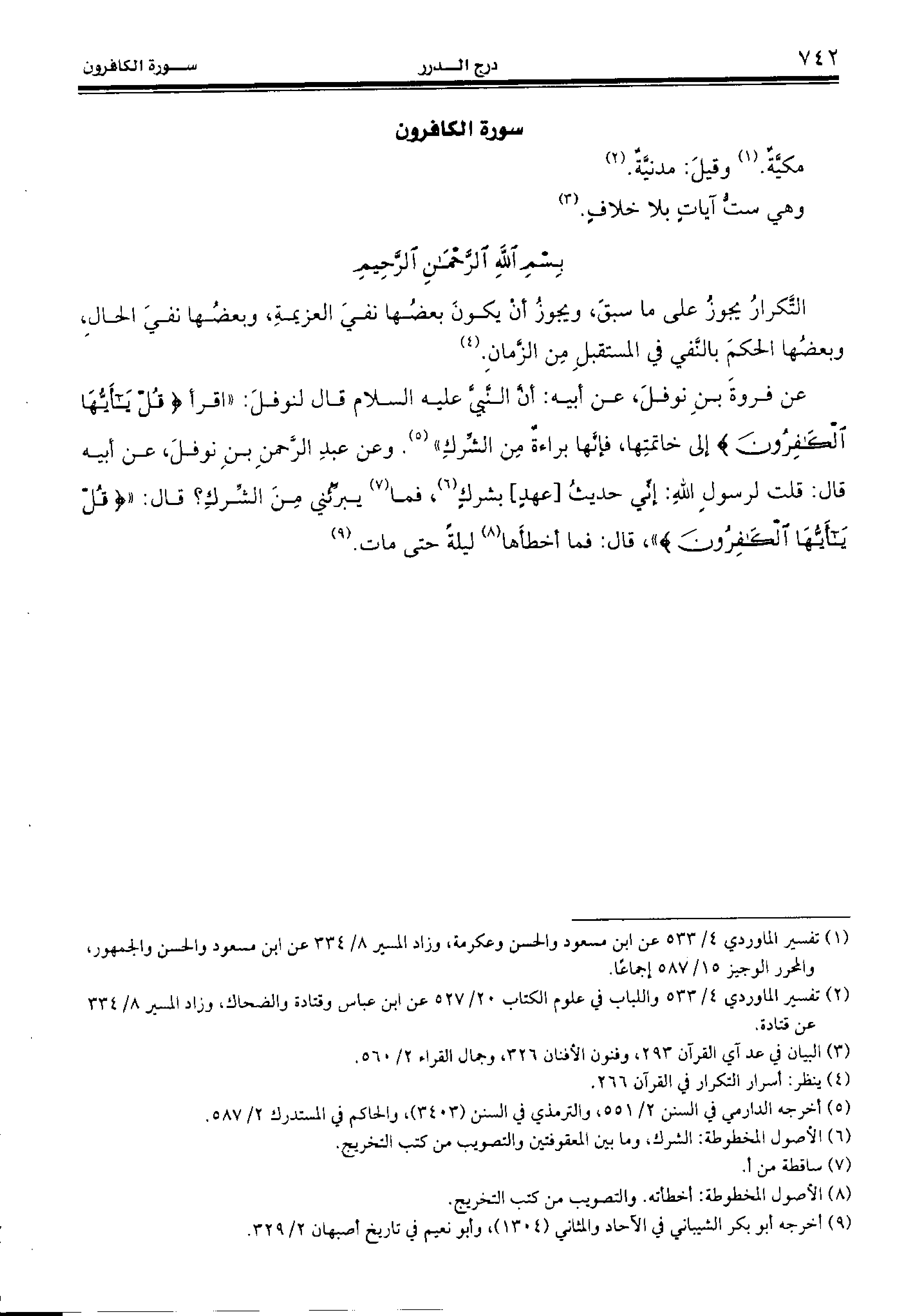 بسم الله الرّحمن الرّحيم التّكرار يجوز على ما سبق، ويجوز أن يكون بعضها نفي العزيمة، وبعضها نفي الحال، وبعضها الحكم بالنّفي في المستقبل من الزّمان. (¬4)
