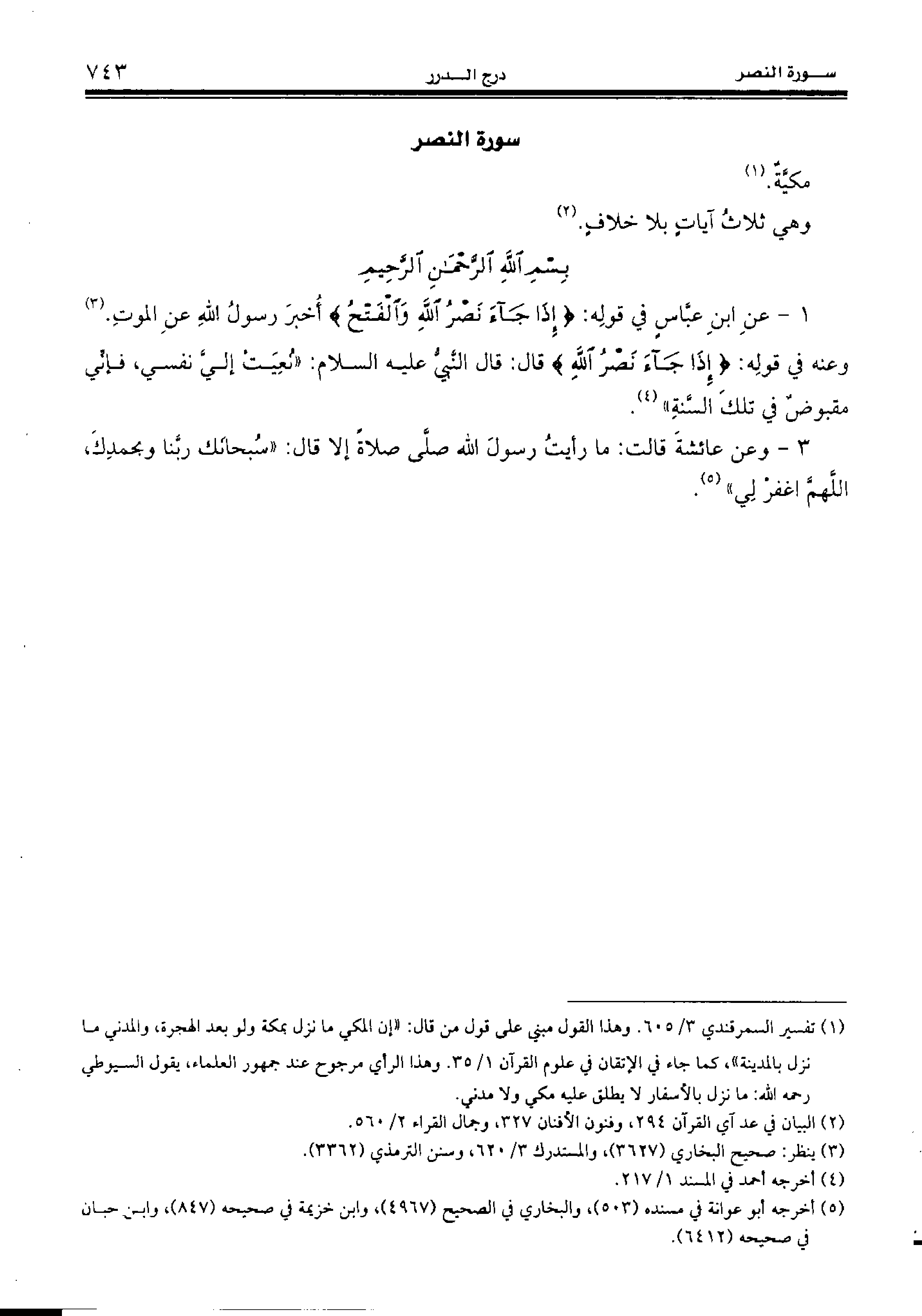 (¬1) تفسير السمرقندي 3/ 605. وهذا القول مبني على قول من قال: «إن المكي ما نزل بمكة ولو بعد الهجرة، والمدني ما نزل بالمدينة»، كما جاء في الإتقان في علوم القرآن 1/ 35. وهذا الرأي مرجوح عند جمهور العلماء، يقول السيوطي رحمه الله: ما نزل بالأسفار لا يطلق عليه مكي ولا مدني.