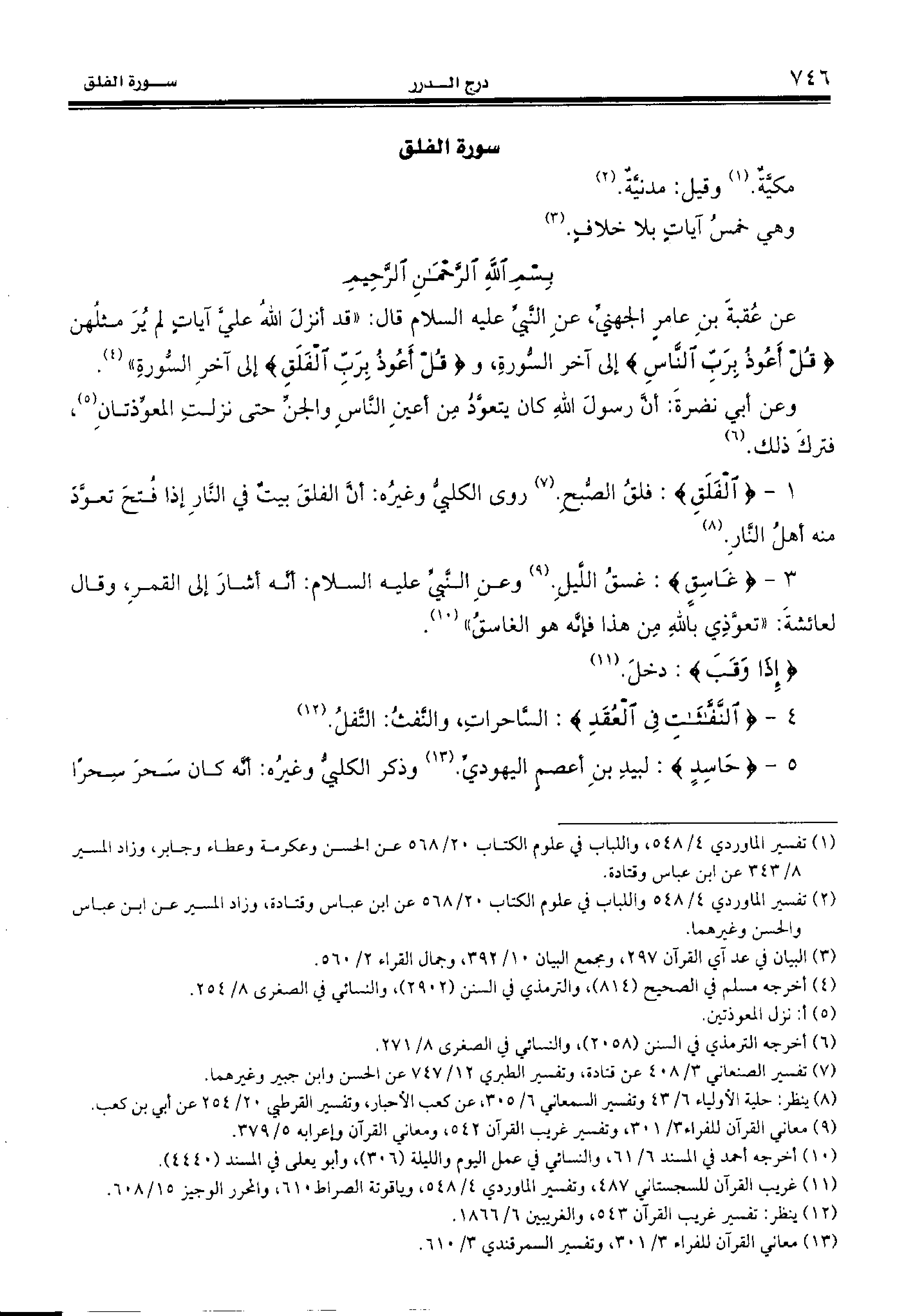 1 - {الْفَلَقِ:} فلق الصّبح. (¬7) روى الكلبيّ وغيره: أنّ الفلق بيت في النّار إذا فتح تعوّد منه أهل النّار. (¬8)