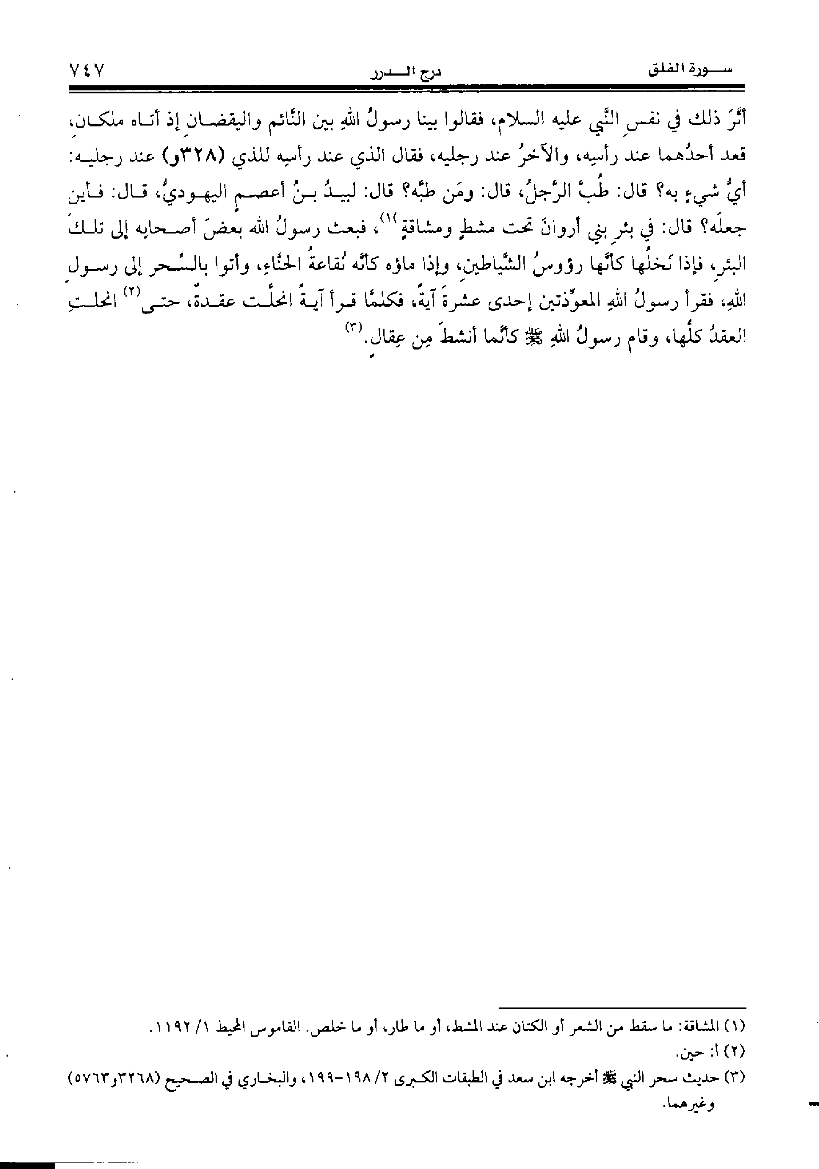 (¬3) حديث سحر النبي صلّى الله عليه وسلّم أخرجه ابن سعد في الطبقات الكبرى 2/ 198 - 199، والبخاري في الصحيح (3268 و 5763) وغيرهما.