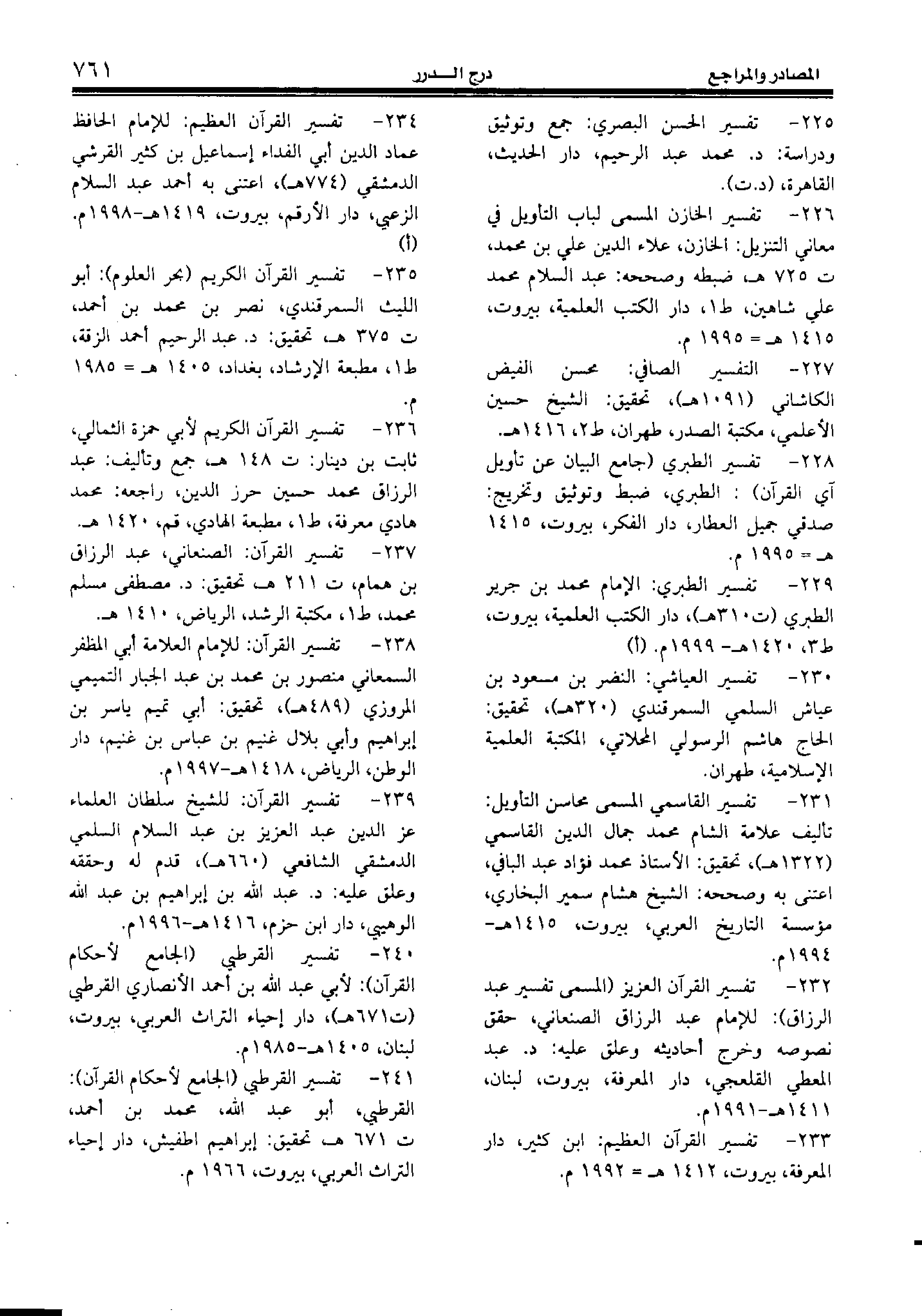 226 - تفسير الخازن المسمى لباب التأويل في معاني التنزيل: الخازن، علاء الدين علي بن محمد، ت 725 هـ، ضبطه وصححه: عبد السّلام محمد علي شاهين، ط 1، دار الكتب العلمية، بيروت، 1415 هـ-1995 م.