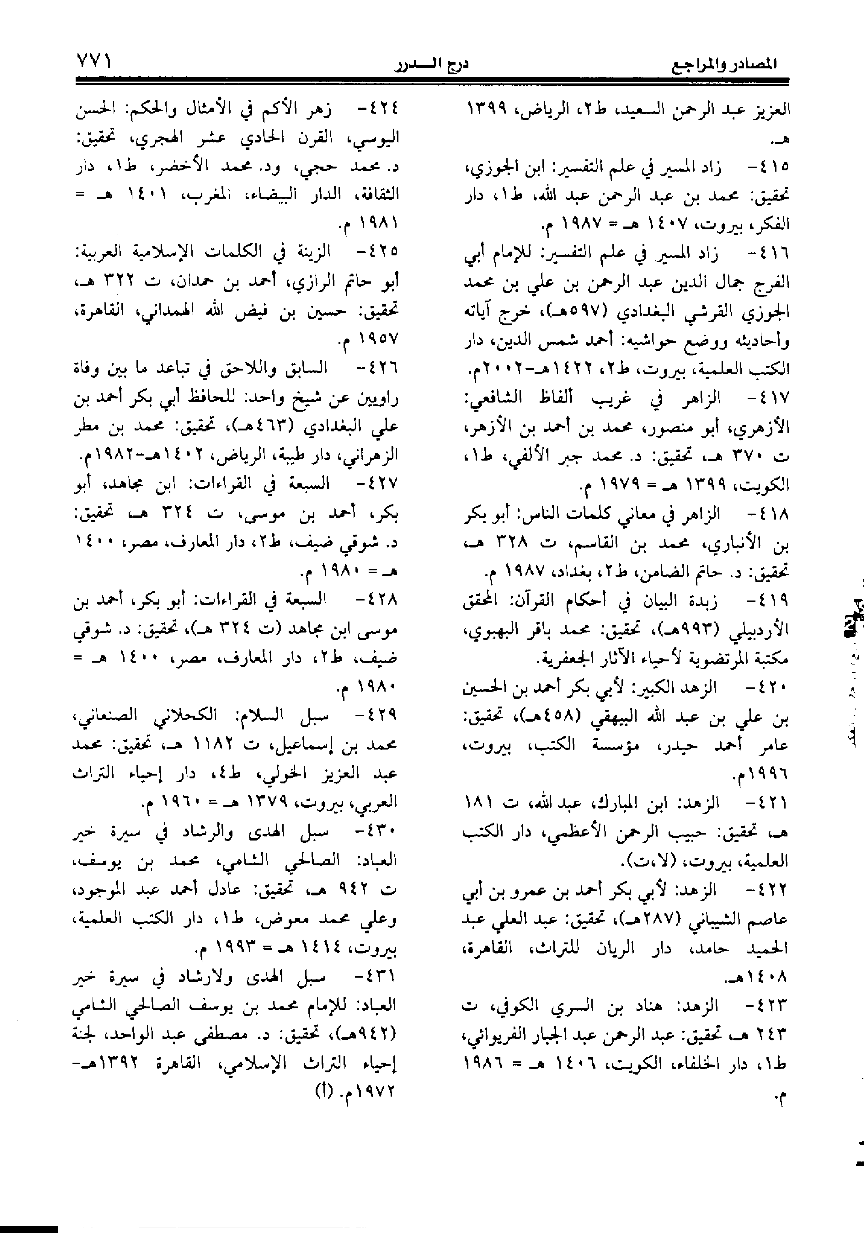 416 - زاد المسير في علم التفسير: للإمام أبي الفرج جمال الدين عبد الرحمن بن علي بن محمد الجوزي القرشي البغدادي (597 هـ)، خرج آياته وأحاديثه ووضع حواشيه: أحمد شمس الدين، دار الكتب العلمية، بيروت، ط 2،1422 هـ-2002 م.