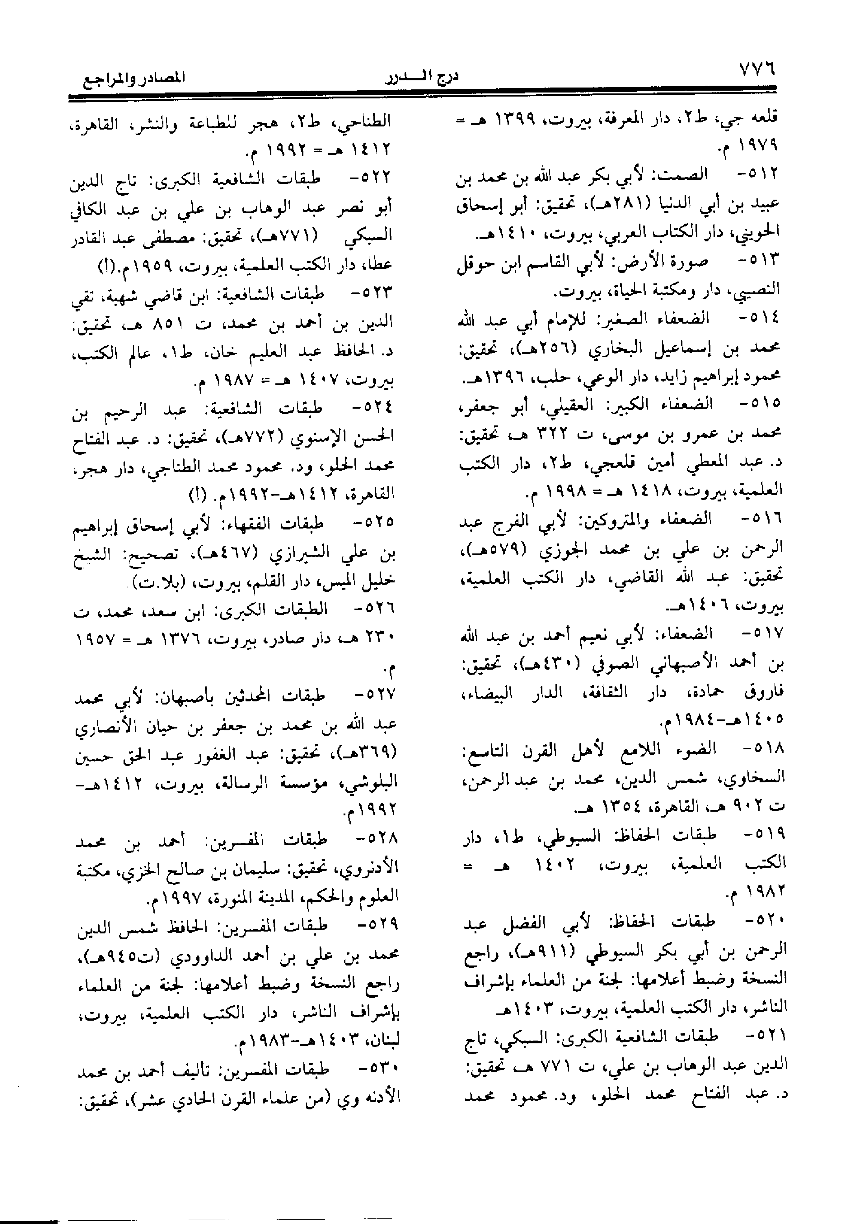 522 - طبقات الشافعية الكبرى: تاج الدين أبو نصر عبد الوهاب بن علي بن عبد الكافي السبكي (771 هـ)، تحقيق: مصطفى عبد القادر عطا، دار الكتب العلمية، بيروت،1959 م. (أ)