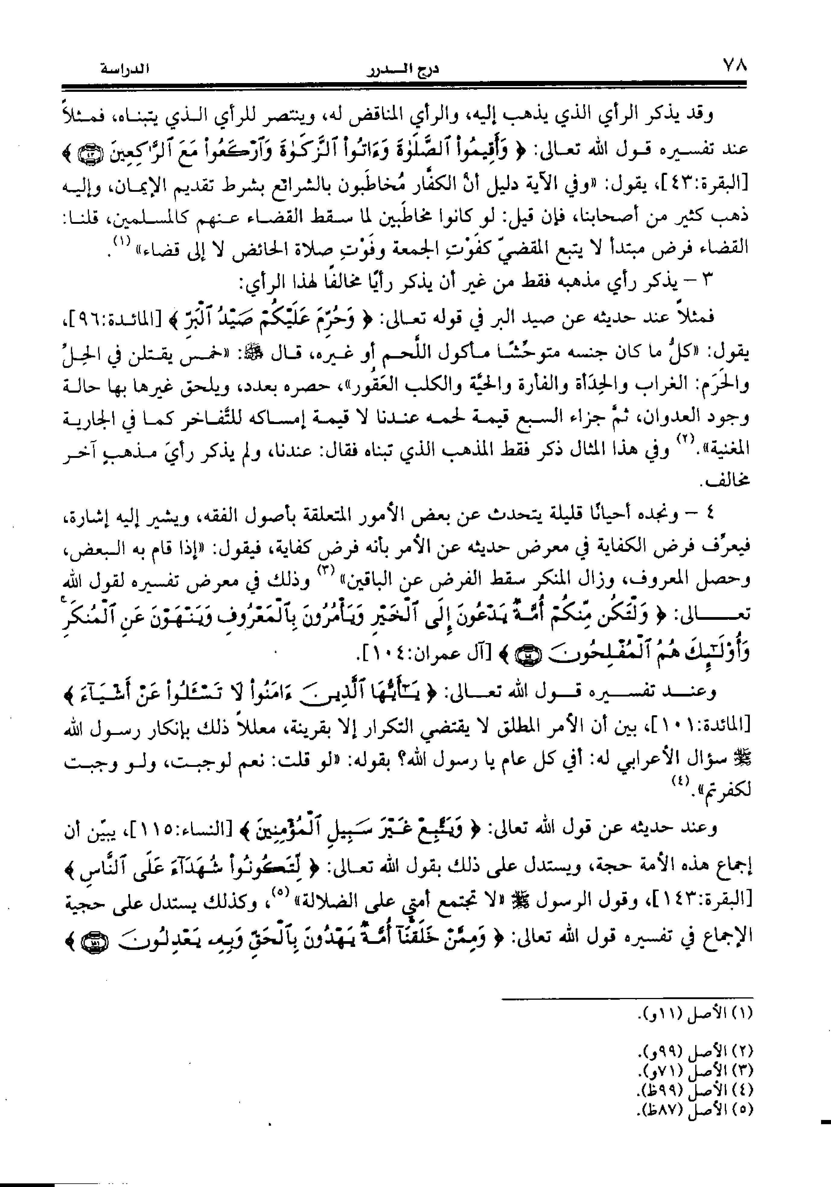 4 - ونجده أحيانا قليلة يتحدث عن بعض الأمور المتعلقة بأصول الفقه، ويشير إليه إشارة، فيعرّف فرض الكفاية في معرض حديثه عن الأمر بأنه فرض كفاية، فيقول: «إذا قام به البعض، وحصل المعروف، وزال المنكر سقط الفرض عن الباقين» (¬3) وذلك في معرض تفسيره لقول الله تعالى: {وَلْتَكُنْ مِنْكُمْ أُمَّةٌ يَدْعُونَ إِلَى الْخَيْرِ وَيَأْمُرُونَ بِالْمَعْرُوفِ وَيَنْهَوْنَ عَنِ الْمُنْكَرِ وَأُولئِكَ هُمُ الْمُفْلِحُونَ} (104) [آل عمران:104].