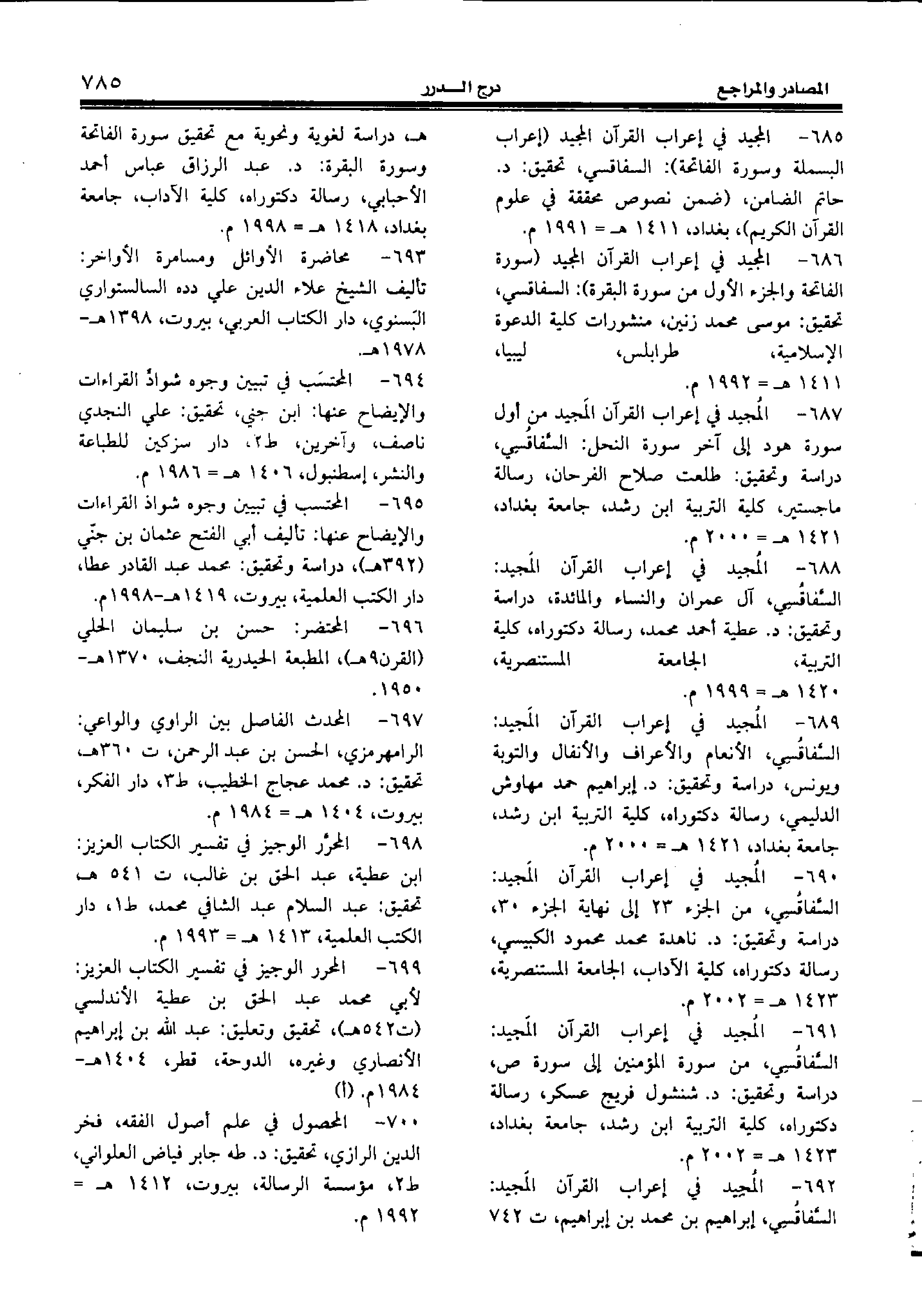 686 - المجيد في إعراب القرآن المجيد (سورة الفاتحة والجزء الأول من سورة البقرة): السفاقسي، تحقيق: موسى محمد زنين، منشورات كلية الدعوة الإسلامية، طرابلس، ليبيا، 1411 هـ-1992 م.