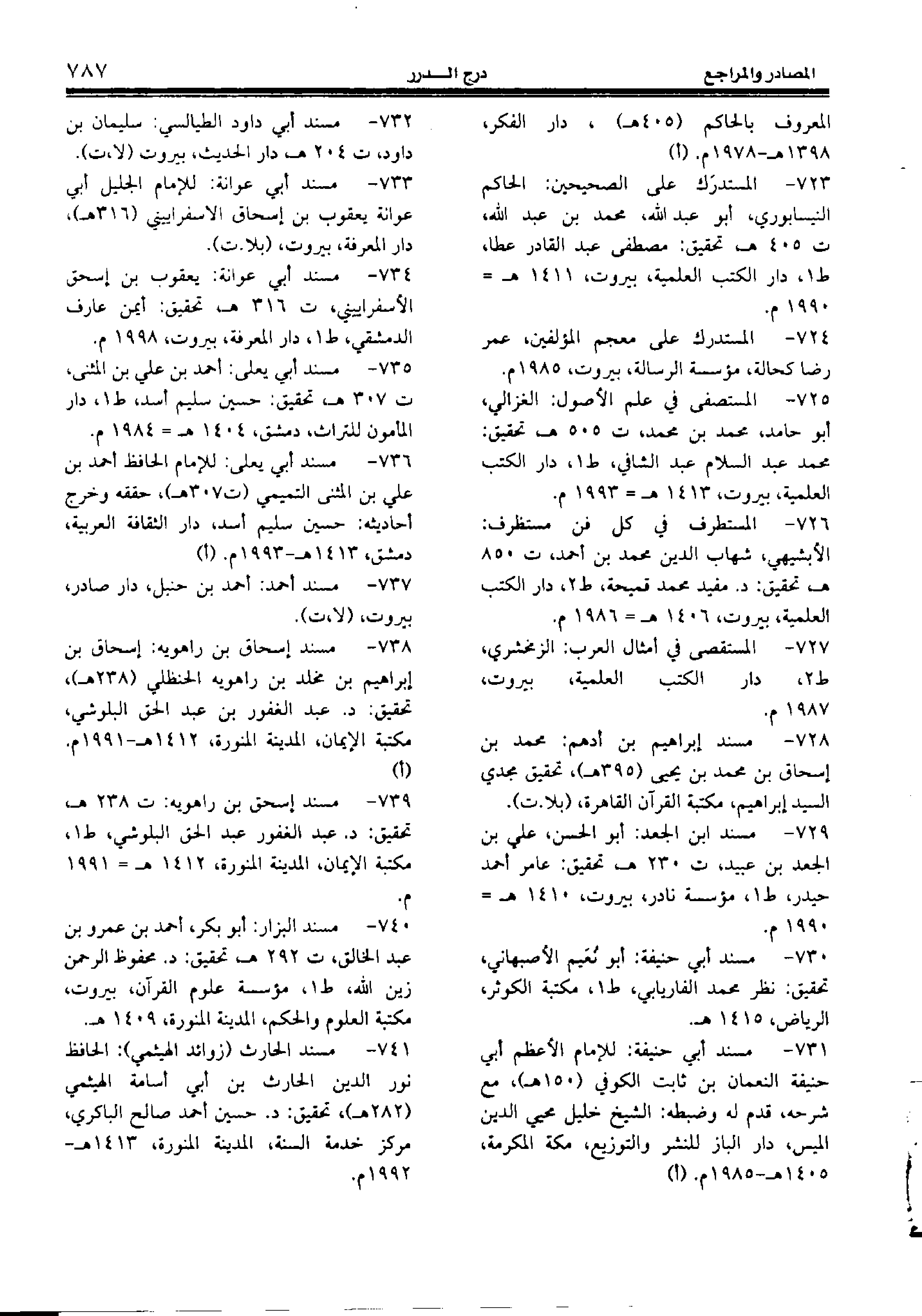 731 - مسند أبي حنيفة: للإمام الأعظم أبي حنيفة النعمان بن ثابت الكوفي (150 هـ)، مع شرحه، قدم له وضبطه: الشيخ خليل محيي الدين الميس، دار الباز للنشر والتوزيع، مكة المكرمة، 1405 هـ-1985 م. (أ)