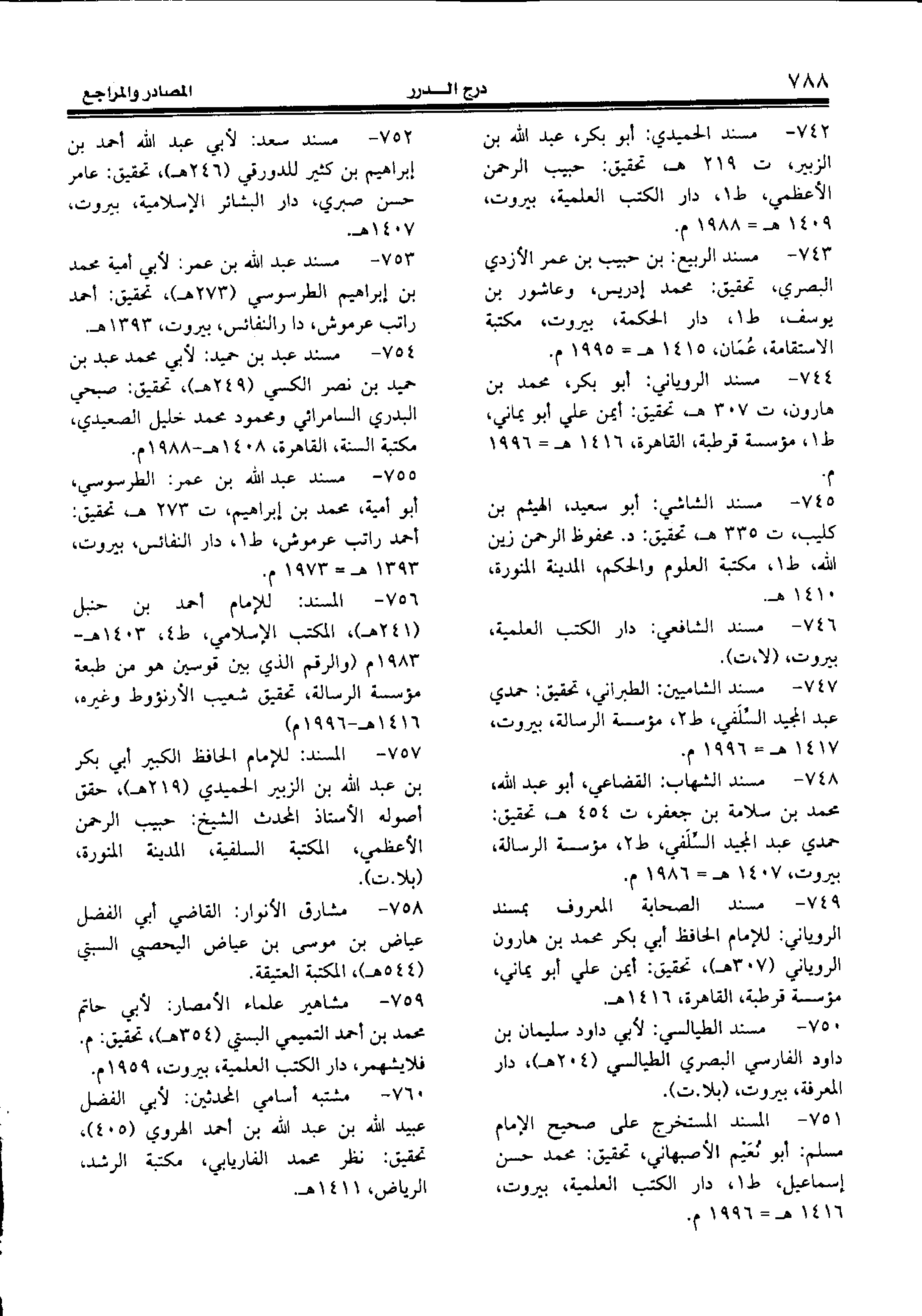 757 - المسند: للإمام الحافظ الكبير أبي بكر بن عبد الله بن الزبير الحميدي (219 هـ)، حقق أصوله الأستاذ المحدث الشيخ: حبيب الرحمن الأعظمي، المكتبة السلفية، المدينة المنورة، (بلا. ت).