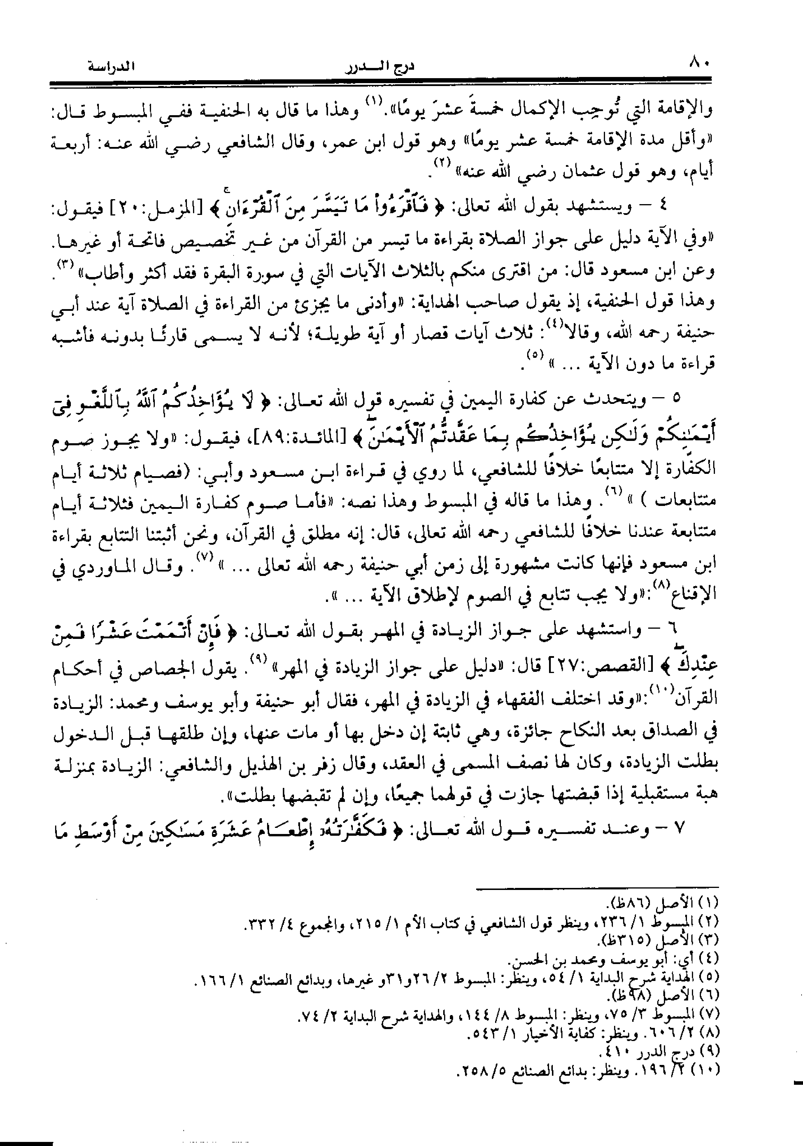5 - ويتحدث عن كفارة اليمين في تفسيره قول الله تعالى: {لا يُؤاخِذُكُمُ اللهُ بِاللَّغْوِ فِي أَيْمانِكُمْ وَلكِنْ يُؤاخِذُكُمْ بِما عَقَّدْتُمُ الْأَيْمانَ} [المائدة:89]، فيقول: «ولا يجوز صوم الكفّارة إلا متتابعا خلافا للشافعي، لما روي في قراءة ابن مسعود وأبي: (فصيام ثلاثة أيام متتابعات)» (¬6). وهذا ما قاله في المبسوط وهذا نصه: «فأما صوم كفارة اليمين فثلاثة أيام متتابعة عندنا خلافا للشافعي رحمه الله تعالى، قال: إنه مطلق في القرآن، ونحن أثبتنا التتابع بقراءة ابن مسعود فإنها كانت مشهورة إلى زمن أبي حنيفة رحمه الله تعالى. . .» (¬7). وقال الماوردي في الإقناع (¬8): «ولا يجب تتابع في الصوم لإطلاق الآية. . .».
