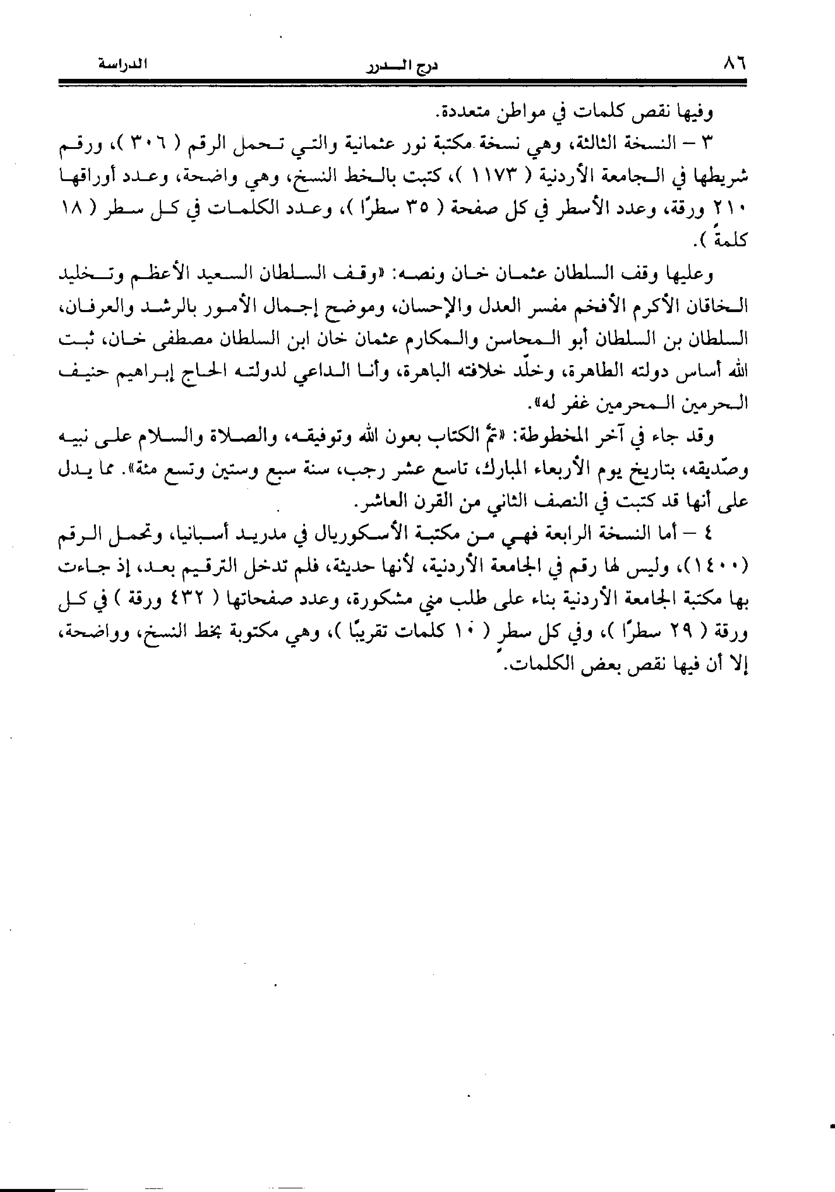 3 - النسخة الثالثة، وهي نسخة مكتبة نور عثمانية والتي تحمل الرقم (306)، ورقم شريطها في الجامعة الأردنية (1173)، كتبت بالخط النسخ، وهي واضحة، وعدد أوراقها 210 ورقة، وعدد الأسطر في كل صفحة (35 سطرا)، وعدد الكلمات في كل سطر (18 كلمة).