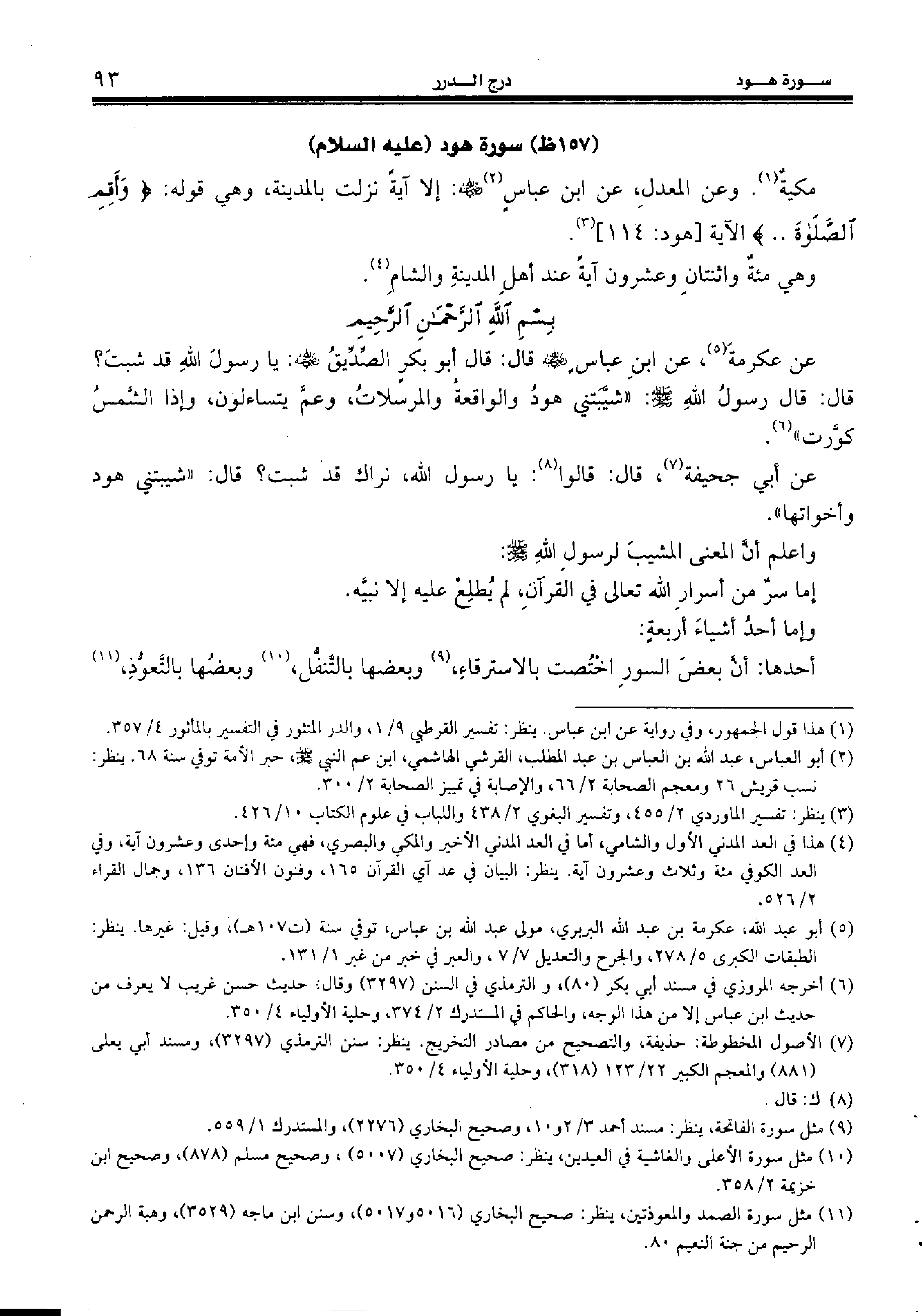 بسم الله الرّحمن الرّحيم عن عكرمة (¬5)، عن ابن عباس رضي الله عنه قال: قال أبو بكر الصّدّيق رضي الله عنه: يا رسول الله قد شبت؟ قال: قال رسول الله صلّى الله عليه وسلّم: «شيّبتني هود والواقعة والمرسلات، وعمّ يتساءلون، وإذا الشّمس كوّرت» (¬6).