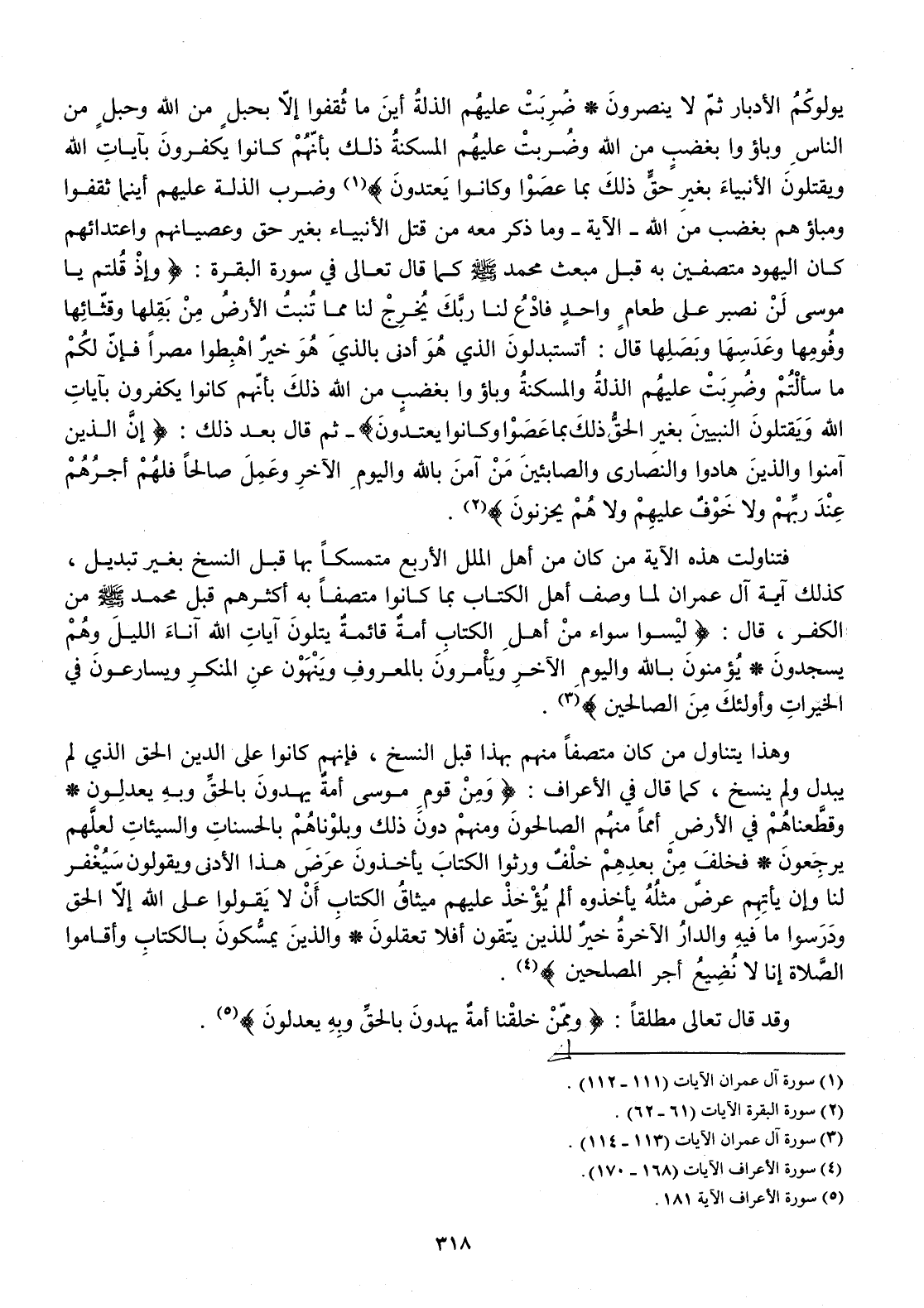 وَهَذَا يتَنَاوَل من كَانَ متصفا مِنْهُم بِهَذَا قبل النّسخ فَإِنَّهُم كَانُوا على الدّين الْحق الَّذِي لم يُبدل وَلم ينْسَخ كَمَا قَالَ فِي الْأَعْرَاف {وَمن قوم مُوسَى أمة يهْدُونَ بِالْحَقِّ وَبِه يعدلُونَ} {وقطعناهم فِي الأَرْض أمما مِنْهُم الصالحون وَمِنْهُم دون ذَلِك وبلوناهم بِالْحَسَنَاتِ والسيئات لَعَلَّهُم يرجعُونَ فخلف من بعدهمْ خلف ورثوا الْكتاب يَأْخُذُونَ عرض هَذَا الْأَدْنَى وَيَقُولُونَ سيغفر لنا وَإِن يَأْتهمْ عرض مثله يأخذوه ألم يُؤْخَذ عَلَيْهِم مِيثَاق الْكتاب أَن لَا يَقُولُوا على الله إِلَّا الْحق ودرسوا مَا فِيهِ وَالدَّار الْآخِرَة خير للَّذين يَتَّقُونَ أَفلا تعقلون وَالَّذين يمسكون بِالْكتاب وَأَقَامُوا الصَّلَاة إِنَّا لَا نضيع أجر المصلحين} وَقد قَالَ تَعَالَى مُطلقًا {وَمِمَّنْ خلقنَا أمة يهْدُونَ بِالْحَقِّ وَبِه يعدلُونَ}