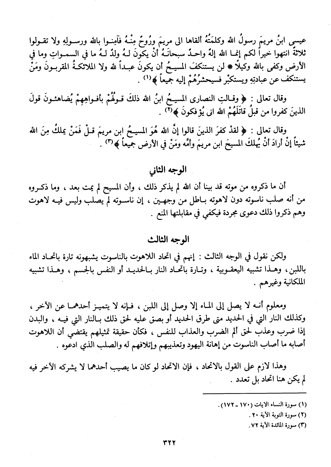 وَلَكِن نقُول فِي الْوَجْه الثَّالِث إِنَّهُم فِي اتِّحَاد اللاهوت بالناسوت يشبهونه تَارَة باتحاد المَاء بِاللَّبنِ وَهَذَا تَشْبِيه اليعقوبية وَتارَة باتحاد النَّار بالحديد أَو النَّفس بالجسم وَهَذَا تَشْبِيه الملكانية وَغَيرهم