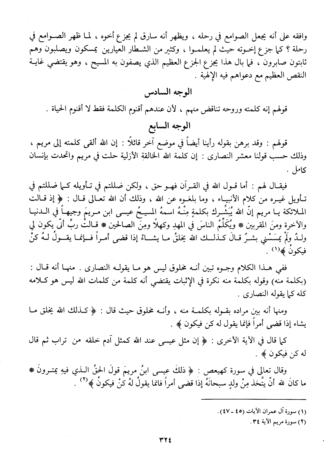 فَفِي هَذَا الْكَلَام وُجُوه تبين أَنه مَخْلُوق لَيْسَ هُوَ مَا يَقُوله النَّصَارَى مِنْهَا أَنه قَالَ بِكَلِمَة مِنْهُ وَقَوله بِكَلِمَة مِنْهُ نكرَة فِي الْإِثْبَات يَقْتَضِي أَنه كلمة من كَلِمَات الله لَيْسَ هُوَ كَلَامه كُله كَمَا يَقُوله النَّصَارَى
