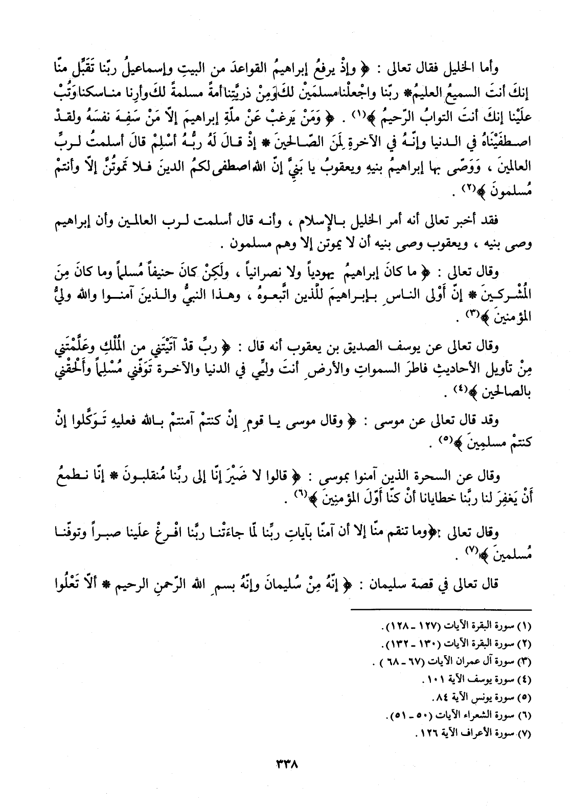 وَأما الْخَلِيل فَقَالَ تَعَالَى {وَإِذ يرفع إِبْرَاهِيم الْقَوَاعِد من الْبَيْت وَإِسْمَاعِيل رَبنَا تقبل منا إِنَّك أَنْت السَّمِيع الْعَلِيم رَبنَا واجعلنا مُسلمين لَك وَمن ذريتنا أمة مسلمة لَك وأرنا مناسكنا وَتب علينا إِنَّك أَنْت التواب الرَّحِيم} {وَمن يرغب عَن مِلَّة إِبْرَاهِيم إِلَّا من سفه نَفسه وَلَقَد اصطفيناه فِي الدُّنْيَا وَإنَّهُ فِي الْآخِرَة لمن الصَّالِحين إِذْ قَالَ لَهُ ربه أسلم قَالَ أسلمت لرب الْعَالمين ووصى بهَا إِبْرَاهِيم بنيه وَيَعْقُوب يَا بني إِن الله اصْطفى لكم الدّين فَلَا تموتن إِلَّا وَأَنْتُم مُسلمُونَ}