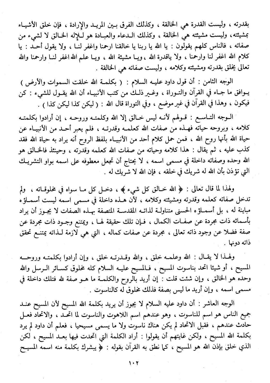الْوَجْه الْعَاشِر أَن دَاوُد عَلَيْهِ السَّلَام لَا يجوز أَن يُرِيد بِكَلِمَة الله الْمَسِيح لِأَن الْمَسِيح عِنْد جَمِيع النَّاس هُوَ اسْم للناسوت وَهُوَ عِنْدهم اسْم اللاهوت والناسوت لما اتَّحد والاتحاد فعل حَادث عِنْدهم فَقبل الِاتِّحَاد لم يكن هُنَاكَ ناسوت وَلَا مَا يُسمى مسيحيا فَعلم أَن دَاوُد لم يرد بِكَلِمَة الله الْمَسِيح وَلَكِن غايتهم أَن يَقُولُوا أَرَادَ الْكَلِمَة الَّتِي اتّحدت فِيهَا بعد الْمَسِيح لَكِن الَّذِي خلق بِإِذن الله هُوَ الْمَسِيح كَمَا نطق بِهِ الْقُرْآن بقوله {يبشرك بِكَلِمَة مِنْهُ اسْمه الْمَسِيح عِيسَى ابْن مَرْيَم وجيها فِي الدُّنْيَا وَالْآخِرَة وَمن المقربين}