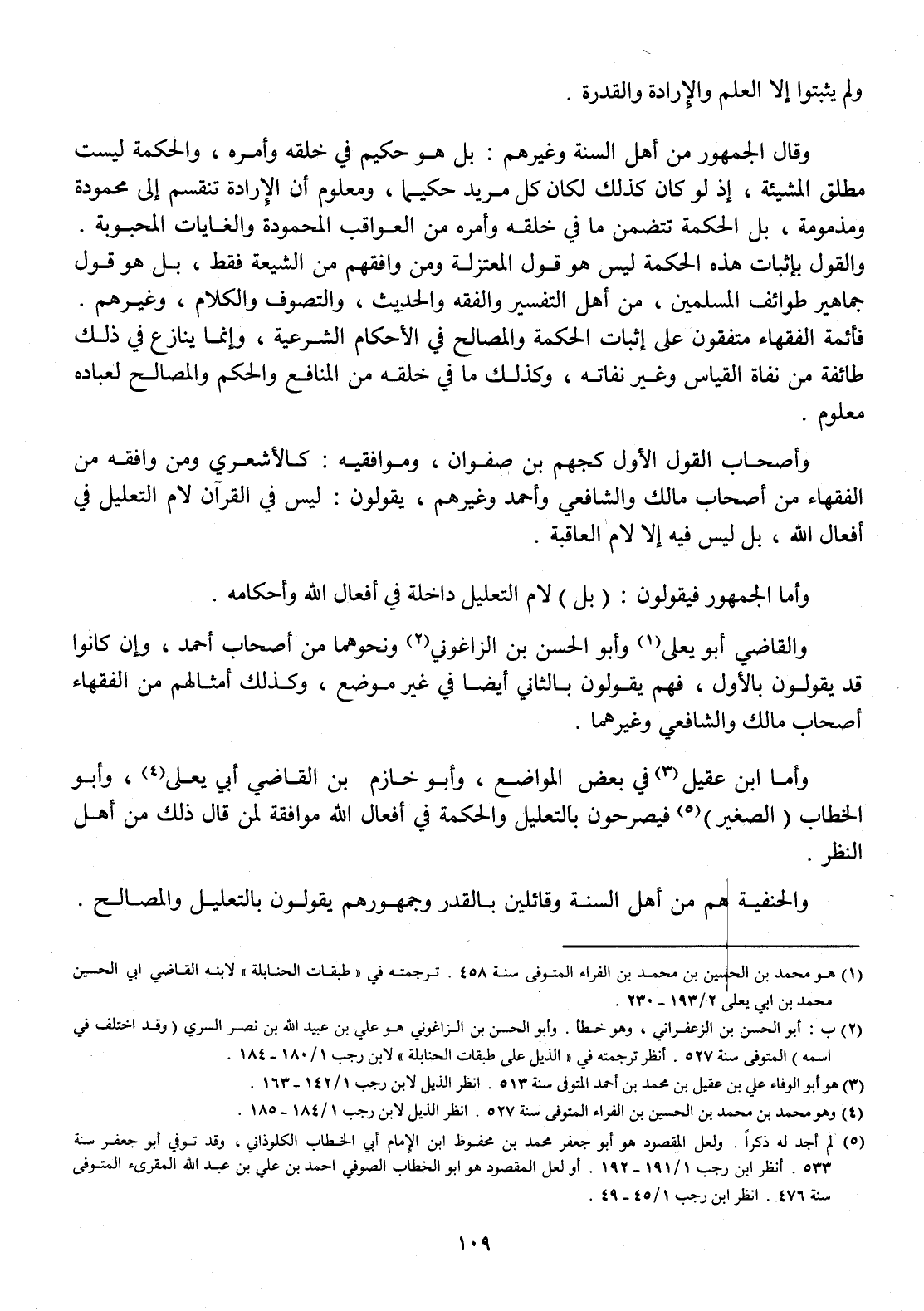 وَأما ابْن عقيل فِي بعض الْمَوَاضِع وَأَبُو خازم بن القَاضِي أبي يعلى وَأَبُو الْخطاب الصَّغِير فيصرحون بِالتَّعْلِيلِ وَالْحكمَة فِي أَفعَال الله مُوَافقَة لمن قَالَ ذَلِك من أهل النّظر