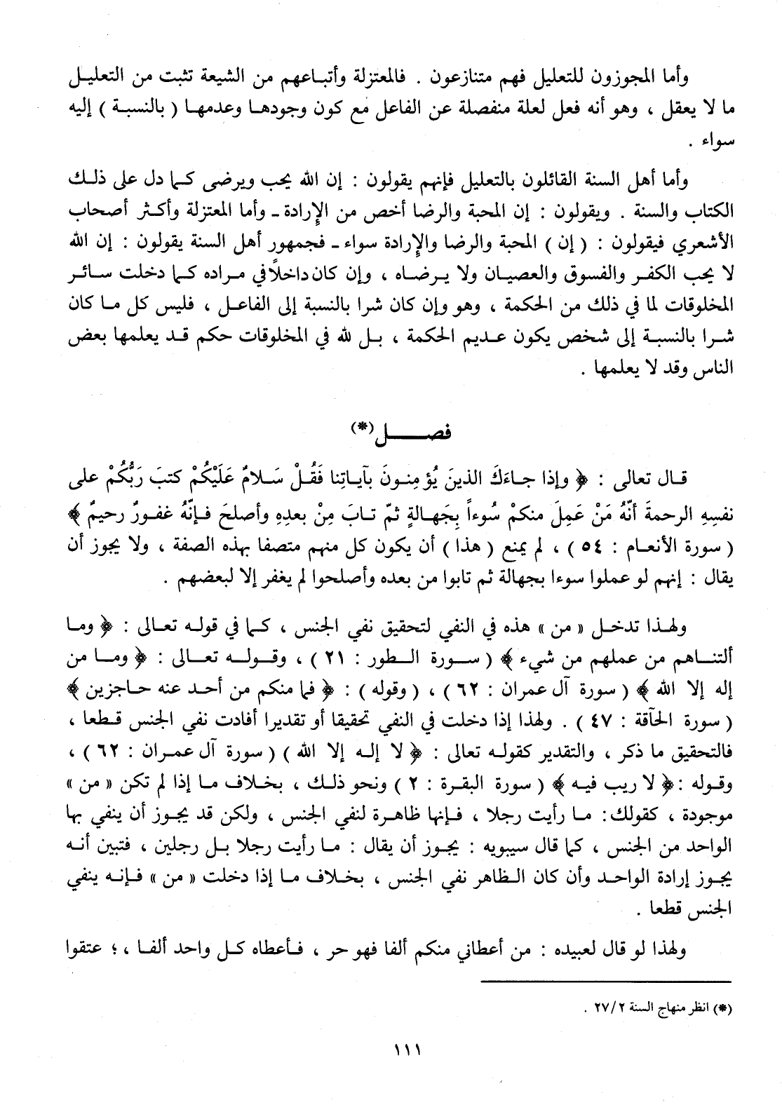 وَأما أهل السّنة الْقَائِلُونَ بِالتَّعْلِيلِ فَإِنَّهُم يَقُولُونَ إِن الله يحب ويرضى كَمَا دلّ على ذَلِك الْكتاب وَالسّنة وَيَقُولُونَ إِن الْمحبَّة وَالرِّضَا أخص من الْإِرَادَة وَأما الْمُعْتَزلَة وَأكْثر أَصْحَاب الْأَشْعَرِيّ فَيَقُولُونَ إِن الْمحبَّة وَالرِّضَا والإرادة سَوَاء فجمهور أهل السّنة يَقُولُونَ إِن الله لَا يحب الْكفْر والفسوق والعصيان وَلَا يرضاه وَإِن كَانَ دَاخِلا فِي مُرَاده كَمَا دخلت سَائِر الْمَخْلُوقَات لما فِي ذَلِك من الْحِكْمَة وَهُوَ وَإِن كَانَ شرا بِالنِّسْبَةِ إِلَى الْفَاعِل فَلَيْسَ كل مَا كَانَ شرا بِالنِّسْبَةِ إِلَى شخص يكون عديم الْحِكْمَة بل لله فِي الْمَخْلُوقَات حكم قد يعلمهَا بعض النَّاس وَقد لَا يعلمهَا