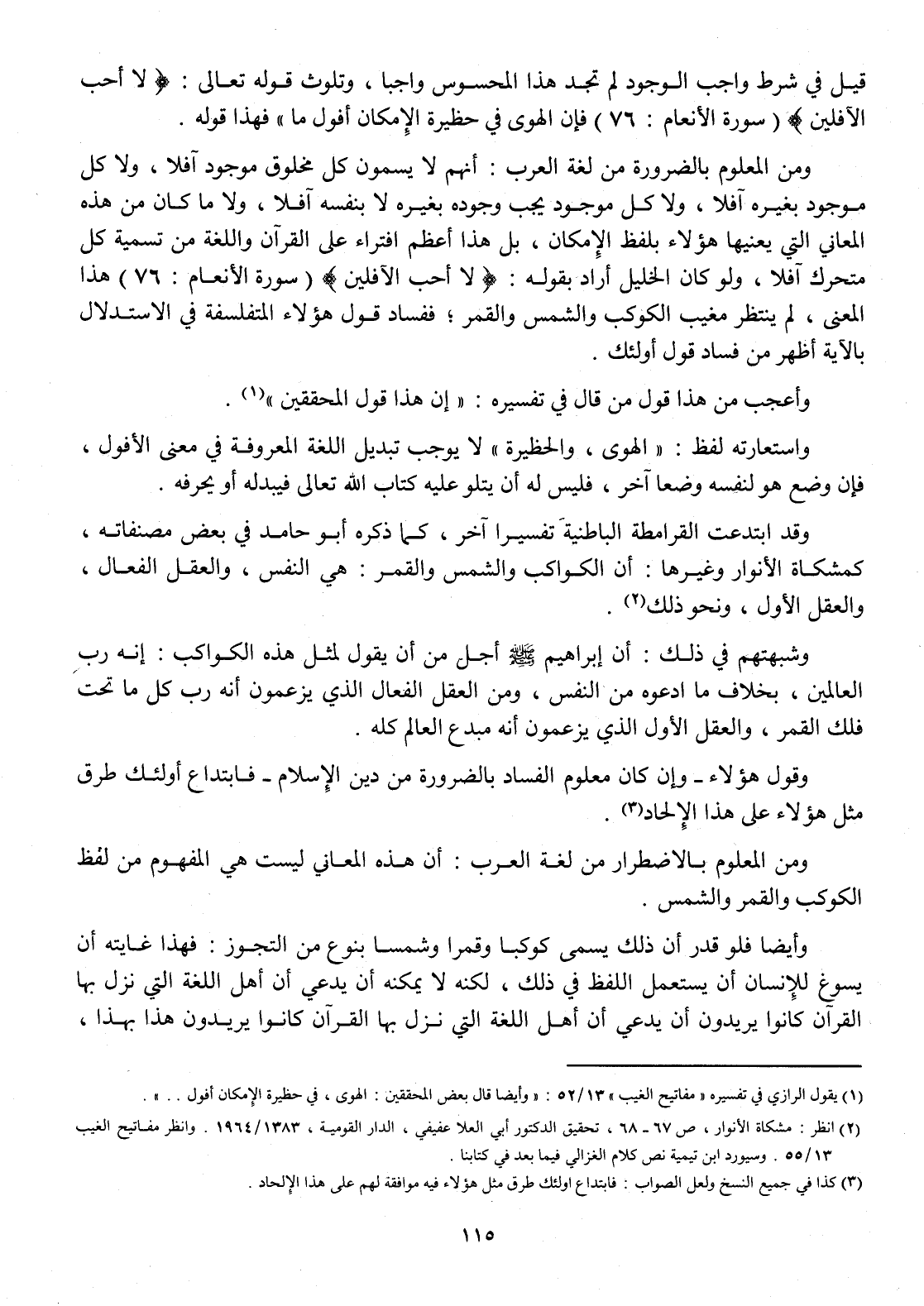 وَمن الْمَعْلُوم بِالضَّرُورَةِ من لُغَة الْعَرَب أَنهم لَا يسمون كل مَخْلُوق مَوْجُود آفلا وَلَا كل مَوْجُود بِغَيْرِهِ آفلا وَلَا كل مَوْجُود يجب وجوده بِغَيْرِهِ لَا بِنَفسِهِ آفلا وَلَا مَا كَانَ من هَذِه الْمعَانِي الَّتِي يعنيها هَؤُلَاءِ بِلَفْظ الْإِمْكَان بل هَذَا أعظم افتراء على الْقُرْآن واللغة من تَسْمِيَة كل متحرك آفلا وَلَو كَانَ الْخَلِيل أَرَادَ بقوله {لَا أحب الآفلين} سُورَة الْأَنْعَام 76 هَذَا الْمَعْنى لم ينْتَظر مغيب الْكَوْكَب وَالشَّمْس وَالْقَمَر ففساد قَول هَؤُلَاءِ المتفلسفة فِي الِاسْتِدْلَال بِالْآيَةِ أظهر من فَسَاد قَول أُولَئِكَ