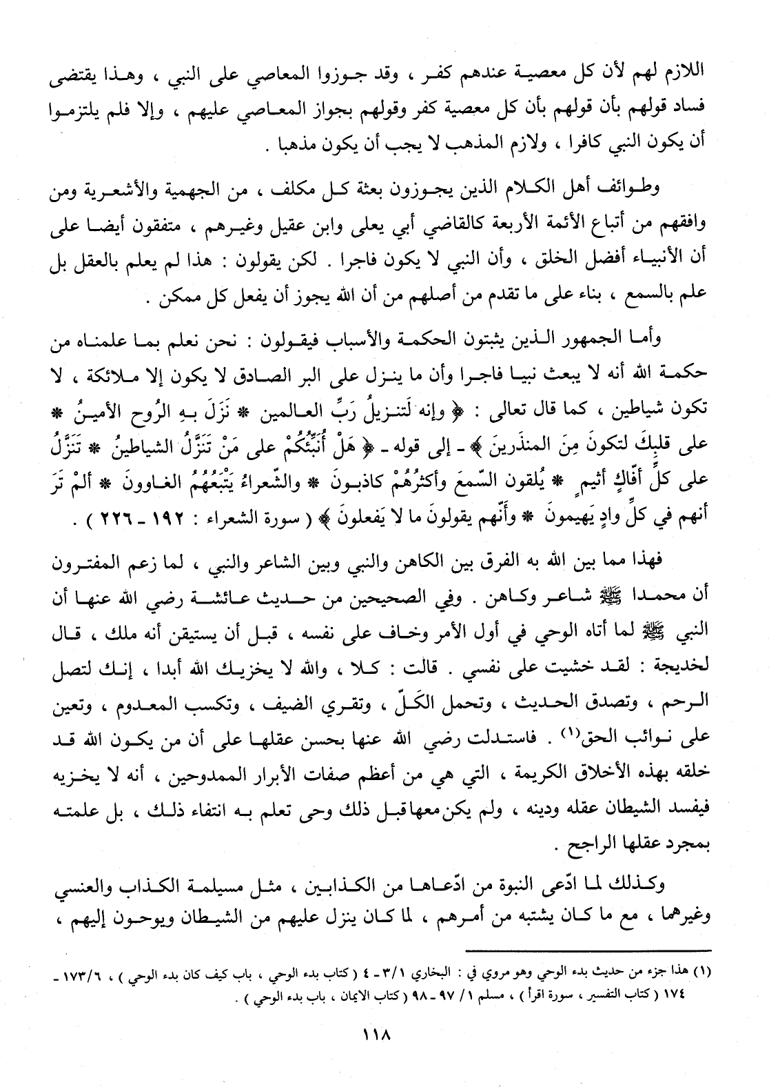 وَأما الْجُمْهُور الَّذين يثبتون الْحِكْمَة والأسباب فَيَقُولُونَ نَحن نعلم بِمَا عَمِلْنَاهُ من حِكْمَة الله أَنه لَا يبْعَث نَبيا فَاجِرًا وَأَن مَا ينزل على الْبر الصَّادِق لَا يكون إِلَّا مَلَائِكَة لَا تكون شياطين كَمَا قَالَ تَعَالَى {وَإنَّهُ لتنزيل رب الْعَالمين نزل بِهِ الرّوح الْأمين على قَلْبك لتَكون من الْمُنْذرين} إِلَى قَوْله {هَل أنبئكم على من تنزل الشَّيَاطِين تنزل على كل أفاك أثيم يلقون السّمع وَأَكْثَرهم كاذبون وَالشعرَاء يتبعهُم الْغَاوُونَ ألم تَرَ أَنهم فِي كل وَاد يهيمون وَأَنَّهُمْ يَقُولُونَ مَا لَا يَفْعَلُونَ} سُورَة الشُّعَرَاء 192 226