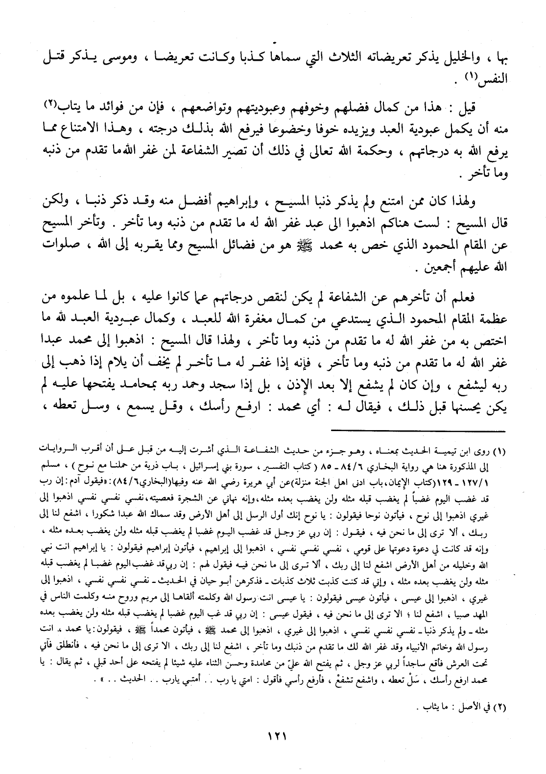 وَلِهَذَا كَانَ مِمَّن امْتنع وَلم يذكر ذَنبا الْمَسِيح وَإِبْرَاهِيم أفضل مِنْهُ وَقد ذكر ذَنبا وَلَكِن قَالَ الْمَسِيح لست هُنَاكُم اذْهَبُوا إِلَى عبد غفر الله لَهُ مَا تقدم من ذَنبه وَمَا تَأَخّر وَتَأَخر الْمَسِيح عَن الْمقَام الْمَحْمُود الَّذِي خص بِهِ مُحَمَّد صلى الله عَلَيْهِ وَسلم هُوَ من فَضَائِل الْمَسِيح وَمِمَّا يقربهُ إِلَى الله صلوَات الله عَلَيْهِم أجميعن