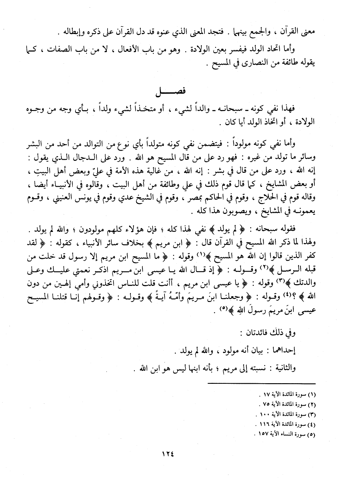 فَقَوله سُبْحَانَهُ {وَلم يُولد} نفي لهَذَا كُله فَإِن هَؤُلَاءِ كلهم مولودون وَالله لم يُولد وَلِهَذَا لما ذكر الله الْمَسِيح فِي الْقُرْآن قَالَ {ابْن مَرْيَم} بِخِلَاف سَائِر الْأَنْبِيَاء كَقَوْلِه {لقد كفر الَّذين قَالُوا إِن الله هُوَ الْمَسِيح} وَقَوله {مَا الْمَسِيح ابْن مَرْيَم إِلَّا رَسُول قد خلت من قبله الرُّسُل} وَقَوله {إِذْ قَالَ الله يَا عِيسَى ابْن مَرْيَم اذكر نعمتي عَلَيْك وعَلى والدتك} وَقَوله {يَا عِيسَى ابْن مَرْيَم أَأَنْت قلت للنَّاس اتخذوني وَأمي إِلَهَيْنِ من دون الله} وَقَوله {وَجَعَلنَا ابْن مَرْيَم وَأمه آيَة} وَقَوله {وَقَوْلهمْ إِنَّا قتلنَا الْمَسِيح عِيسَى ابْن مَرْيَم رَسُول الله}