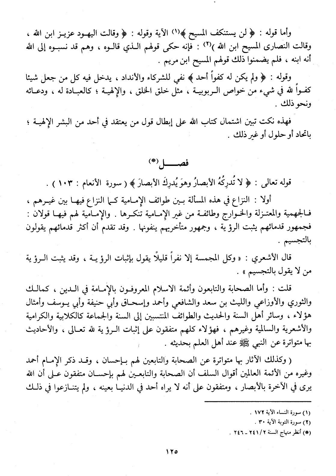 قلت وَأما الصَّحَابَة والتابعون وأئمة الْإِسْلَام المعروفون بِالْإِمَامَةِ فِي الدّين كمالك وَالثَّوْري وَالْأَوْزَاعِيّ وَاللَّيْث بن سعد وَالشَّافِعِيّ وَأحمد وَإِسْحَاق وَأبي حنيفَة وَأبي يُوسُف وأمثال هَؤُلَاءِ وَسَائِر أهل السّنة والْحَدِيث والطوائف المنتسبين إِلَى السّنة وَالْجَمَاعَة كالكلابية والكرامية والأشعرية والسالمية وَغَيرهم فَهَؤُلَاءِ كلهم متفقون على إِثْبَات الرُّؤْيَة لله تَعَالَى وَالْأَحَادِيث بهَا متواترة عَن النَّبِي صلى الله عَلَيْهِ وَسلم عِنْد أهل الْعلم بحَديثه