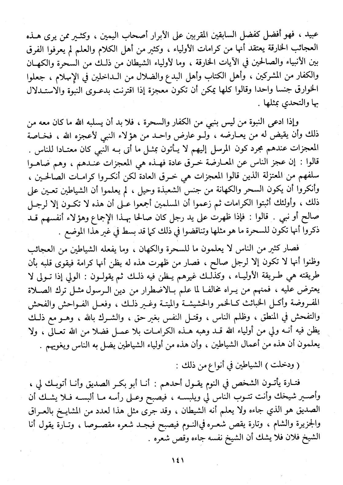 فَصَارَ كثير من النَّاس لَا يعلمُونَ مَا للسحرة والكهان وَمَا يَفْعَله الشَّيَاطِين من الْعَجَائِب وظنوا أَنَّهَا لَا تكون إِلَّا لرجل صَالح فَصَارَ من ظَهرت هَذِه لَهُ يظنّ أَنَّهَا كَرَامَة فيقوى قلبه بِأَن طَرِيقَته هِيَ طَريقَة الْأَوْلِيَاء وَكَذَلِكَ غَيرهم يظنّ فِيهِ ذَلِك ثمَّ يَقُولُونَ الْوَلِيّ إِذا تولى لَا يعْتَرض عَلَيْهِ فَمنهمْ من يرَاهُ مُخَالفا لما علم بالاضطرار من دين الرَّسُول مثل ترك الصَّلَاة الْمَفْرُوضَة وَأكل الْخَبَائِث كَالْخمرِ والحشيشة وَالْميتَة وَغير ذَلِك وَفعل الْفَوَاحِش وَالْفُحْش والتفحش فِي الْمنطق وظلم النَّاس وَقتل النَّفس بِغَيْر حق والشرك بِاللَّه وَهُوَ مَعَ ذَلِك يظنّ فِيهِ أَنه ولي من أَوْلِيَاء الله قد وهبه هَذِه الكرامات بِلَا عمل فضلا من الله تَعَالَى وَلَا يعلمُونَ أَن هَذِه من أَعمال الشَّيَاطِين وَأَن هَذِه من أَوْلِيَاء الشَّيَاطِين يضل بِهِ النَّاس ويغويهم