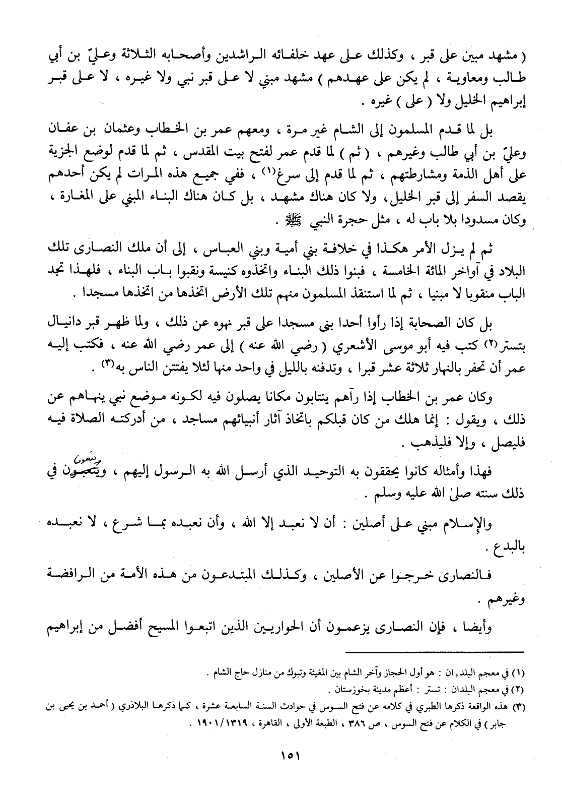 بل لما قدم الْمُسلمُونَ إِلَى الشَّام غير مرّة وَمَعَهُمْ عمر بن الْخطاب وَعُثْمَان بن عَفَّان وَعلي بن أبي طَالب وَغَيرهم ثمَّ لما قدم عمر لفتح بَيت الْمُقَدّس ثمَّ لما قدم لوضع الْجِزْيَة على أهل الذِّمَّة ومشارطتهم ثمَّ لما قدم إِلَى سرغ فَفِي جَمِيع هَذِه المرات لم يكن أحدهم يقْصد السّفر إِلَى قبر الْخَلِيل وَلَا كَانَ هُنَاكَ مشْهد بل كَانَ هُنَاكَ الْبناء الْمَبْنِيّ على المغارة وَكَانَ مسدودا بِلَا بَاب لَهُ مثل حجَّة النَّبِي صلى الله عَلَيْهِ وَسلم