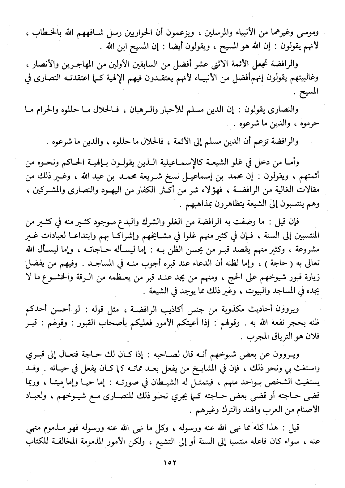 فَإِن قيل مَا وصفت بِهِ الرافضة من الغلو والشرك والبدع مَوْجُود كثير مِنْهُ فِي كثير من المنتسبين إِلَى السّنة فَإِن فِي كثير مِنْهُم غلوا فِي مشايخهم وإشراكا بهم وابتداعا لعبادات غير مَشْرُوعَة وَكثير مِنْهُم يقْصد قبر من يحسن الظَّن بِهِ إِمَّا ليسأله حاجاته وَإِمَّا ليسأل الله تَعَالَى بِهِ حَاجَة وَإِمَّا لظَنّه أَن الدُّعَاء عِنْد قَبره أجوب مِنْهُ فِي الْمَسَاجِد وَفِيهِمْ من يفضل زِيَارَة قبورشيوخهم على الْحَج وَمِنْهُم من يجد عِنْد قبر من يعظمه من الرقة والخشوع مَا لَا يجده فِي الْمَسَاجِد والبيوت وَغير ذَلِك مِمَّا يُوجد فِي الشِّيعَة