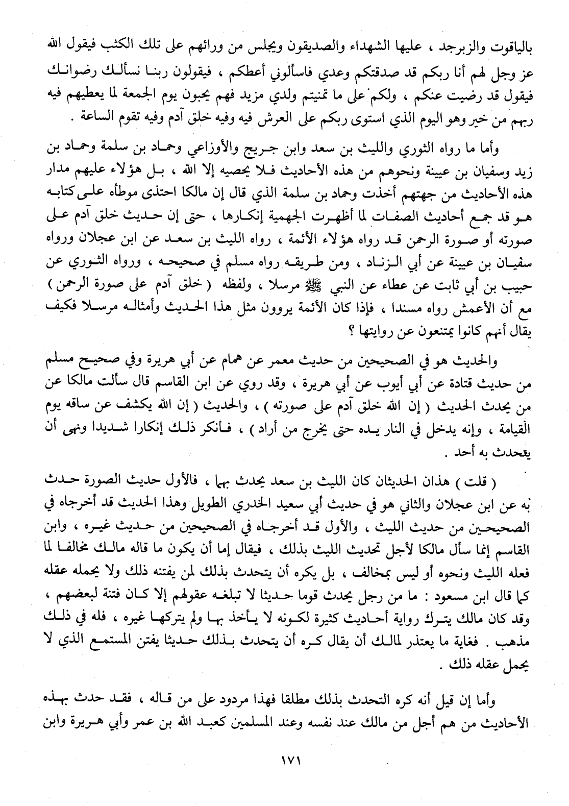 وَأما مَا رَوَاهُ الثَّوْريّ وَاللَّيْث بن سعد وَابْن جريج وَالْأَوْزَاعِيّ وَحَمَّاد بن سَلمَة وَحَمَّاد بن زيد وسُفْيَان بن عُيَيْنَة وَنَحْوهم من هَذِه الْأَحَادِيث فَلَا يُحْصِيه إِلَّا الله بل هَؤُلَاءِ عَلَيْهِم مدَار هَذِه الْأَحَادِيث من جهتهم أخذت وَحَمَّاد بن سَلمَة الَّذِي قَالَ إِن مَالِكًا احتذى موطأه على كِتَابه هُوَ قد جمع أَحَادِيث الصِّفَات لما أظهرت الْجَهْمِية إنكارها حَتَّى إِن حَدِيث خلق آدم على صورته أَو صُورَة الرَّحْمَن قد رَوَاهُ هَؤُلَاءِ الْأَئِمَّة رَوَاهُ اللَّيْث بن سعد عَن ابْن عجلَان وَرَوَاهُ سُفْيَان بن عُيَيْنَة عَن أبي الزِّنَاد وَمن طَرِيقه رَوَاهُ مُسلم فِي صَحِيحه وَرَوَاهُ الثَّوْريّ عَن حبيب بن أبي ثَابت عَن عَطاء عَن النَّبِي صلى الله عَلَيْهِ وَسلم مُرْسلا وَلَفظه خلق آدم على صُورَة الرَّحْمَن مَعَ أَن الْأَعْمَش رَوَاهُ مُسْندًا فَإِذا كَانَ الْأَئِمَّة يروون مثل هَذَا الحَدِيث وَأَمْثَاله مُرْسلا فَكيف يُقَال أَنهم كَانُوا يمتنعون عَن رِوَايَتهَا