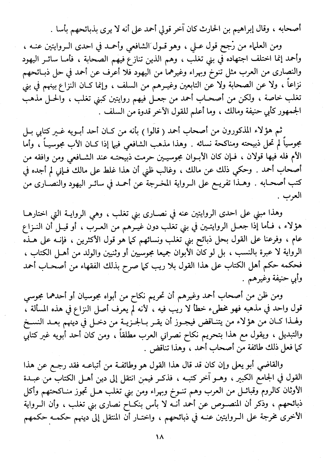 وَمن الْعلمَاء من رجح قَول عَليّ وَهُوَ قَول الشَّافِعِي وَأحمد فِي إِحْدَى الرِّوَايَتَيْنِ عَنهُ وَأحمد إِنَّمَا اخْتلف اجْتِهَاده فِي بني تغلب وهم الَّذين تنَازع فيهم الصَّحَابَة فَأَما سَائِر الْيَهُود وَالنَّصَارَى من الْعَرَب مثل تنوخ وبهراء وَغَيرهمَا من الْيَهُود فَلَا أعرف عَن أَحْمد فِي حل ذَبَائِحهم نزاعا وَلَا عَن الصَّحَابَة وَلَا عَن التَّابِعين وَغَيرهم من السّلف وَإِنَّمَا كَانَ النزاع بَينهم فِي بني تغلب خَاصَّة وَلَكِن من أَصْحَاب أَحْمد من جعل فيهم رِوَايَتَيْنِ كبني تغلب والحل مَذْهَب الْجُمْهُور كَأبي حنيفَة وَمَالك وَمَا أعلم لِلْقَوْلِ الآخر قدوة من السّلف