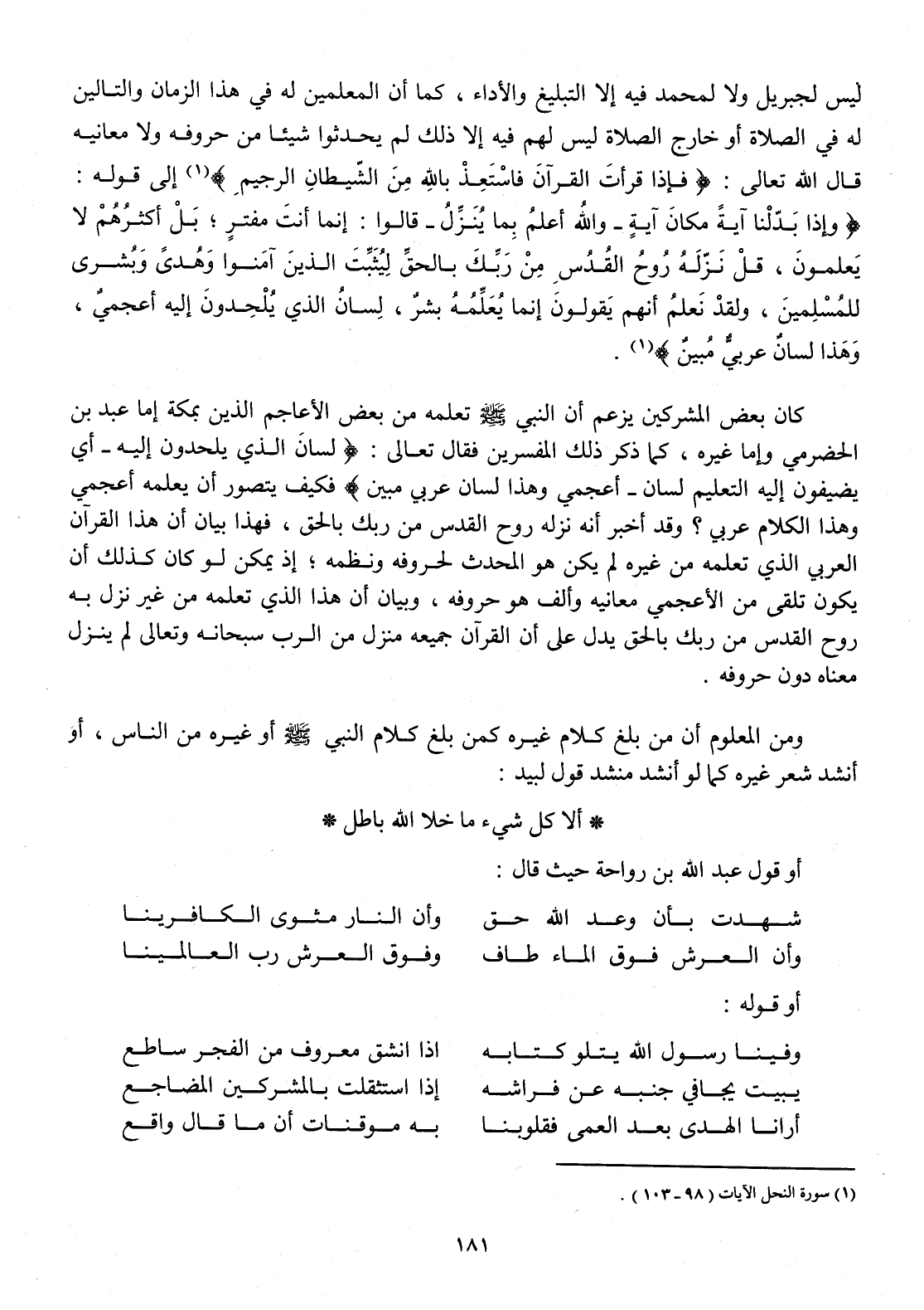 كَانَ بعض الْمُشْركين يزْعم أَن النَّبِي صلى الله عَلَيْهِ وَسلم تعلمه من بعض الْأَعَاجِم الَّذين بِمَكَّة إِمَّا عبد بن الْحَضْرَمِيّ وَإِمَّا غَيره كَمَا ذكر ذَلِك الْمُفَسّرين فَقَالَ تَعَالَى {لِسَان الَّذِي يلحدون إِلَيْهِ} أَي يضيفون إِلَيْهِ التَّعْلِيم لِسَان {أعجمي وَهَذَا لِسَان عَرَبِيّ مُبين} فَكيف يتَصَوَّر من يُعلمهُ أعجمي وَهَذَا الْكَلَام عَرَبِيّ وَقد أخبر أَنه نزله روح الْقُدس من رَبك بِالْحَقِّ فَهَذَا بَيَان أَن هَذَا الْقُرْآن الْعَرَبِيّ الَّذِي تعلمه من غَيره لم يكن هُوَ الْمُحدث لحروفه ونظمه إِذْ يُمكن لَو كَانَ كَذَلِك أَن يكون تلقى من الأعجمي مَعَانِيه وَألف هُوَ حُرُوفه وَبَيَان أَن هَذَا الذ تعلمه من غير نزل بِهِ روح الْقُدس من رَبك بِالْحَقِّ يدل على أَن الْقُرْآن جَمِيعه منزل من الرب سُبْحَانَهُ وَتَعَالَى لم ينزل مَعْنَاهُ دون حُرُوفه