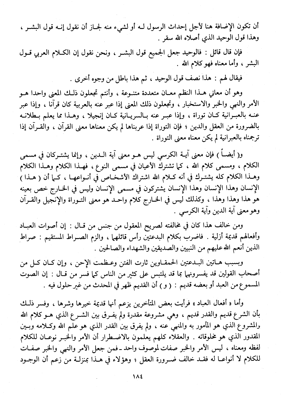 وَأما أَفعَال الْعباد فَرَأَيْت بعض الْمُتَأَخِّرين يزْعم أَنَّهَا قديمَة خَيرهَا وشرها وَفسّر ذَلِك بِأَن الشَّرْع قديم وَالْقدر قديم وَهِي مَشْرُوعَة مقدرَة وَلم يفرق بَين الشَّرْع الَّذِي هُوَ كَلَام الله والمشروع الَّذِي هُوَ الْمَأْمُور بِهِ والمنهي عَنهُ وَلم يفرق بَين الْقدر الَّذِي هُوَ علم الله وَكَلَامه وَبَين الْمَقْدُور الَّذِي هُوَ مخلوقاته والعقلاء كلهم يعلمُونَ بالاضطرار أَن الْأَمر وَالْخَبَر نَوْعَانِ للْكَلَام لَفظه وَمَعْنَاهُ لَيْسَ الْأَمر وَالْخَبَر صِفَات لموصوف وَاحِد فَمن جعل الْأَمر وَالنَّهْي وَالْخَبَر صِفَات للْكَلَام لَا أنواعا لَهُ فقد خَالف ضَرُورَة الْعقل وَهَؤُلَاء فِي هَذَا بِمَنْزِلَة من زعم أَن الْوُجُود