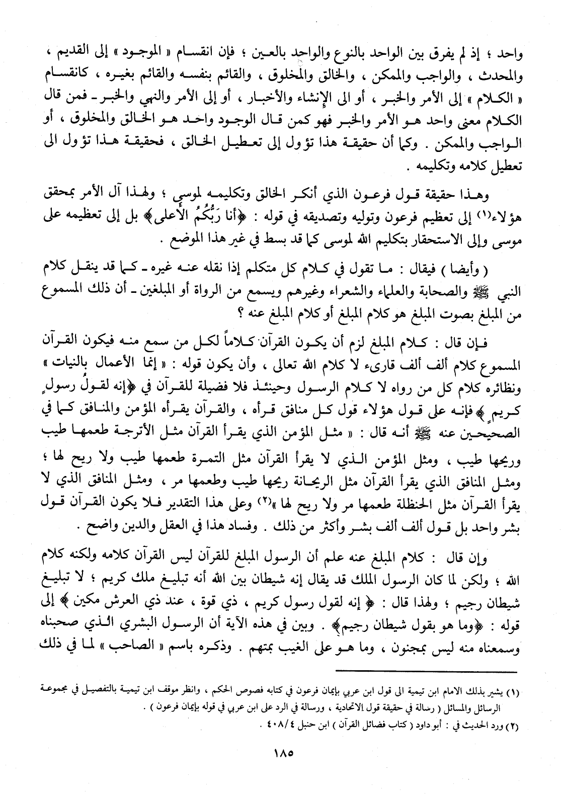 فَإِن قَالَ كَلَام الْمبلغ لزم أَن يكون الْقُرْآن كلَاما لكل من سمع مِنْهُ فَيكون الْقُرْآن المسموع كَلَام ألف ألف قارىء لَا كَلَام الله تَعَالَى وَأَن يكون قَوْله إِنَّمَا الْأَعْمَال بِالنِّيَّاتِ ونظائره كَلَام كل من رَوَاهُ لَا كَلَام الرَّسُول وَحِينَئِذٍ فَلَا فَضِيلَة لِلْقُرْآنِ {إِنَّه لقَوْل رَسُول كريم} فَإِنَّهُ على قَول هَؤُلَاءِ قَول كل مُنَافِق قَرَأَهُ وَالْقُرْآن يقرأه الْمُؤمن وَالْمُنَافِق كَمَا فِي الصَّحِيحَيْنِ عَنهُ صلى الله عَلَيْهِ وَسلم أَنه قَالَ مثل الْمُؤمن الَّذِي يقْرَأ الْقُرْآن مثل الأترجة طعمها طيب وريحها طيب وَمثل الْمُؤمن الَّذِي لَا يقْرَأ الْقُرْآن مثل التمرة طعمها طيب وَلَا ريح لَهَا وَمثل الْمُنَافِق الَّذِي يقْرَأ الْقُرْآن مثل الريحانة رِيحهَا طيب وطعمها مر وَمثل الْمُنَافِق الَّذِي لَا يقْرَأ الْقُرْآن مثل الحنظلة طعمها مر وَلَا ريح لَهَا وعَلى هَذَا التَّقْدِير فَلَا يكون الْقُرْآن قَول بشر وَاحِد بل قَول ألف ألف بشر وَأكْثر من ذَلِك وَفَسَاد هَذَا فِي الْعقل وَالدّين وَاضح