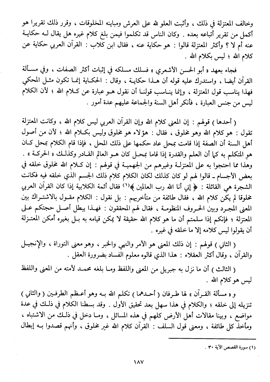 وَمَسْأَلَة الْقُرْآن لَهَا طرفان أَحدهمَا تكلم الله بِهِ وَهُوَ أعظم الطَّرفَيْنِ وَالثَّانِي تَنْزِيله إِلَى خلقه وَالْكَلَام فِي هَذَا سهل بعد تَحْقِيق الأول وَقد بسطنا الْكَلَام فِي ذَلِك فِي عدَّة مَوَاضِع وَبينا مقالات أهل الأَرْض كلهم فِي هَذِه الْمسَائِل وَمَا دخل فِي ذَلِك من الِاشْتِبَاه ومأخذ كل طَائِفَة وَمعنى قَول السّلف الْقُرْآن كَلَام الله غير مَخْلُوق وَأَنَّهُمْ قصدُوا بِهِ إبِْطَال