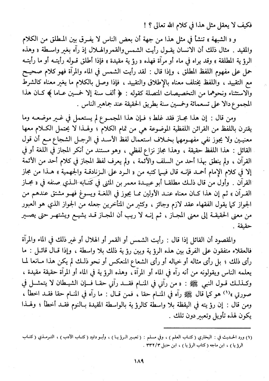 وَالْمَقْصُود أَن الْقَائِل إِذا قَالَ رَأَيْت الشَّمْس أَو الْقَمَر أَو الْهلَال أَو غير ذَلِك فِي المَاء والمرآة فالعقلاء متفقون على الْفرق بَين هَذِه الرُّؤْيَة وَبَين رُؤْيَة ذَلِك بِلَا وَاسِطَة وَإِذا قَالَ قَائِل مَا رأى ذَلِك بل رأى مِثَاله أَو خياله أَو رأى الشعاع المنعكس أَو نَحْو ذَلِك لم يكن هَذَا مَانِعا لما يُعلمهُ النَّاس ويقولونه من أَنه رَآهُ فِي المَاء أَو الْمرْآة وَهَذِه الرُّؤْيَة فِي المَاء أَو الْمرْآة حَقِيقَة مُقَيّدَة وَكَذَلِكَ قَول النَّبِي صلى الله عَلَيْهِ وَسلم من رَآنِي فِي الْمَنَام فقد رَآنِي حَقًا فَإِن الشَّيْطَان لَا يتَمَثَّل فِي صُورَتي هُوَ كَمَا قَالَ صلى الله عَلَيْهِ وَسلم رَآهُ فِي الْمَنَام حَقًا فَمن قَالَ مَا رَآهُ فِي الْمَنَام حَقًا فقد أَخطَأ وَمن قَالَ إِن رُؤْيَته فِي الْيَقَظَة بِلَا وَاسِطَة كالرؤية بالواسطة الْمقيدَة بِالنَّوْمِ فقد أَخطَأ وَلِهَذَا يكون لهَذِهِ تَأْوِيل وتعبير دون تِلْكَ