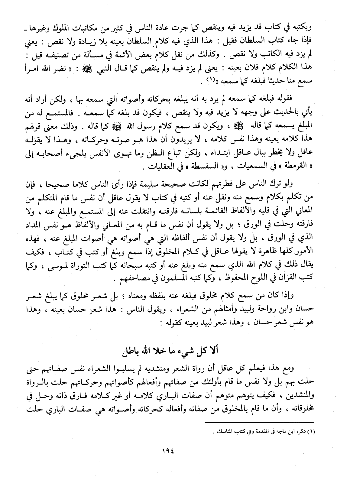 وَإِذا كَانَ من سمع كَلَام مَخْلُوق فَبَلغهُ عَنهُ بِلَفْظِهِ وَمَعْنَاهُ بل شعر مَخْلُوق كَمَا يبلغ شعر حسان وَابْن رَوَاحَة ولبيد وأمثالهم من الشُّعَرَاء وَيَقُول النَّاس هَذَا شعر حسان بِعَيْنِه وَهَذَا هُوَ نفس شعر حسان وَهَذَا شعر لبيد بِعَيْنِه كَقَوْلِه